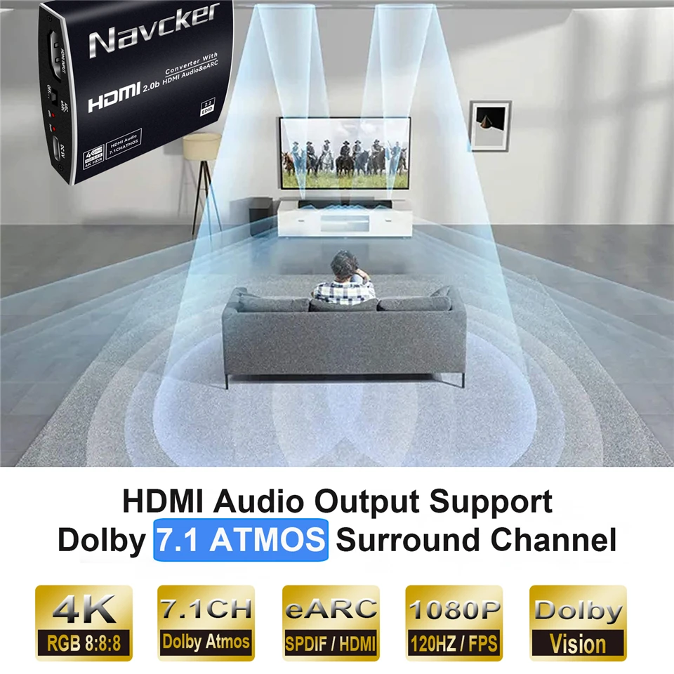 ZY-AV8,Navceker 4K 120Hz HDMI 2,0 eARC аудио экстрактор является высокопроизводительным 1 HDMI вход и 1 HDMI выход переключатель с аудио выход. Аудио только HDMI аудио выход Поддержка функции извлечения звука, аудио только HDMI Поддержка eARC/ARC (Улучшенный Канал возврата аудио). Система поддерживает все форматы 3D TV в дополнение ко всем форматам HDTV до 4K x 2K @ 60/120Hz RGB 8 :8 :8.