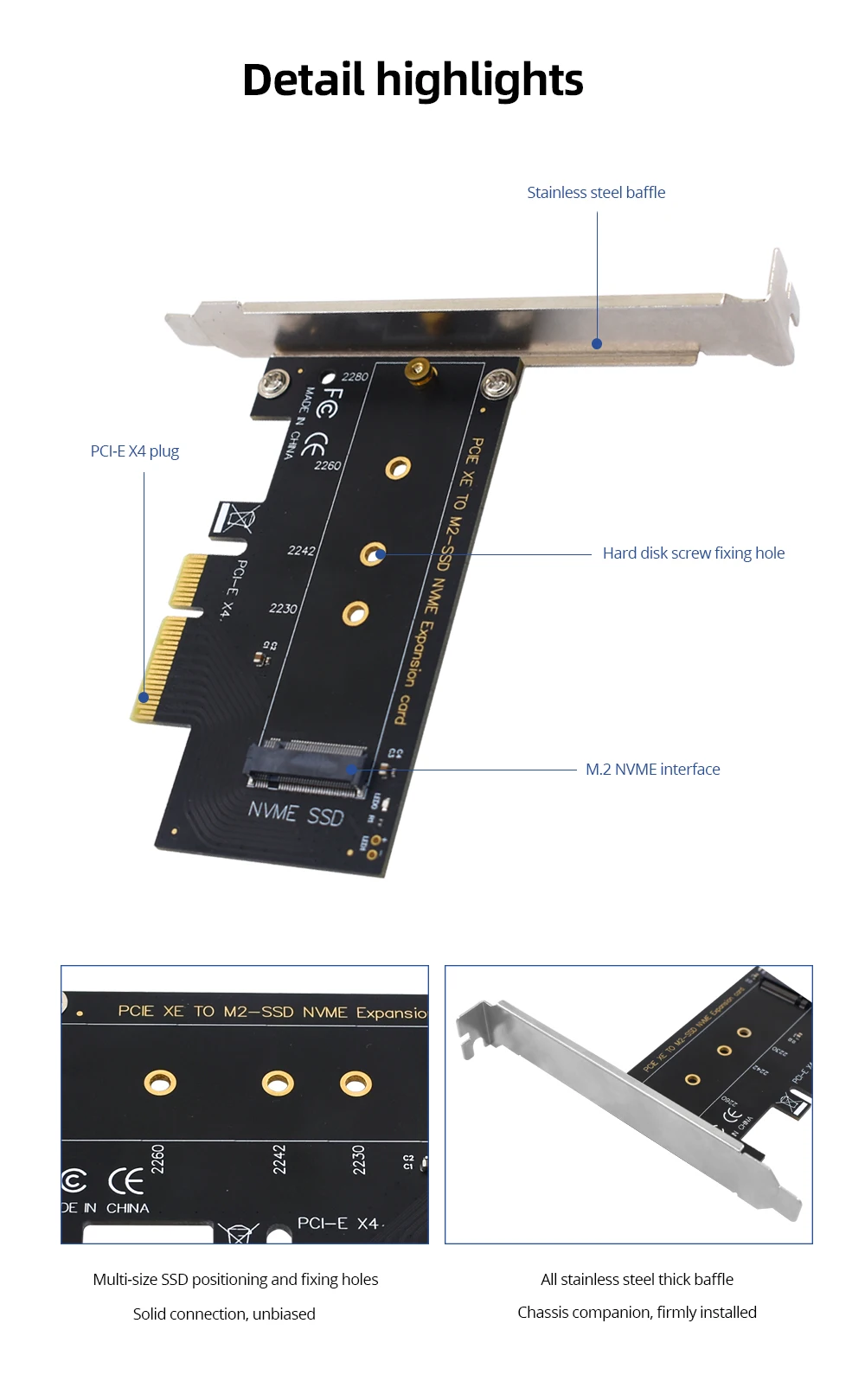 1. M.2 NVME к PCI-E 4X прямое подключение к материнской плате. Толстая позолоченная материнская плата PCI-e gold finger напрямую подключена, и винт перегородки зафиксирован.