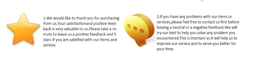 2.If you have any problems with our items or service, please feel free to contact us first before leaving a neutral or a negative feedback. We will try our best to help you solve any problem you encountered. This is important as it will help us to improve our service and to serve you better for your time.
