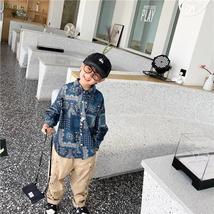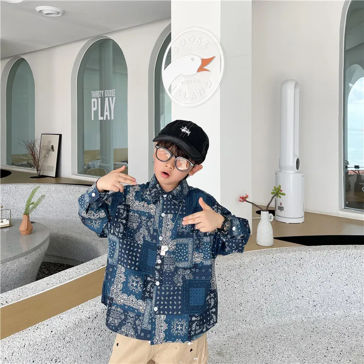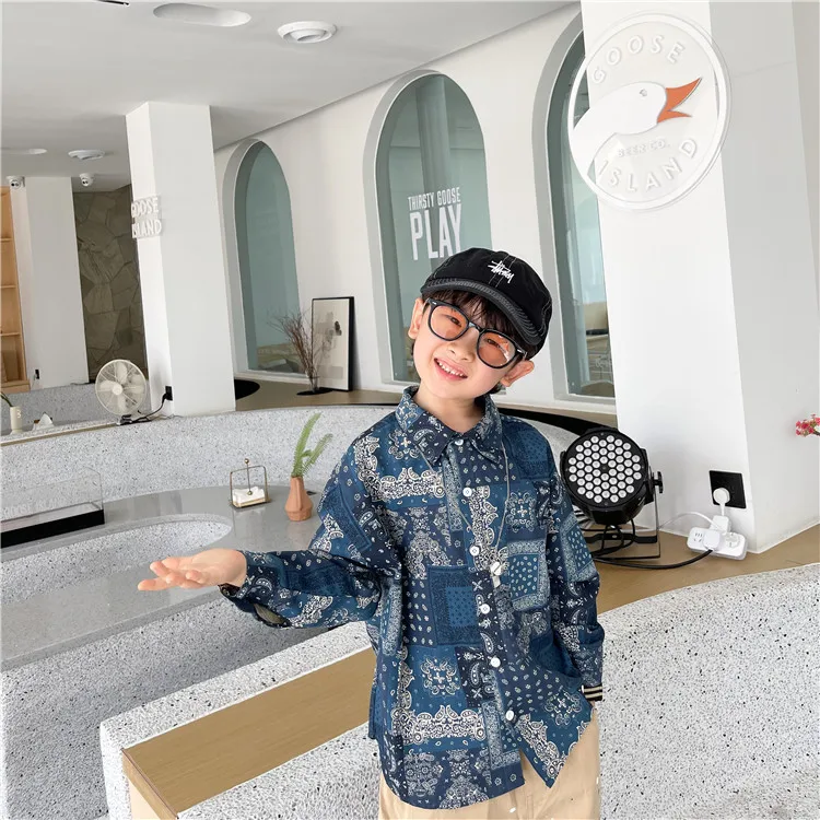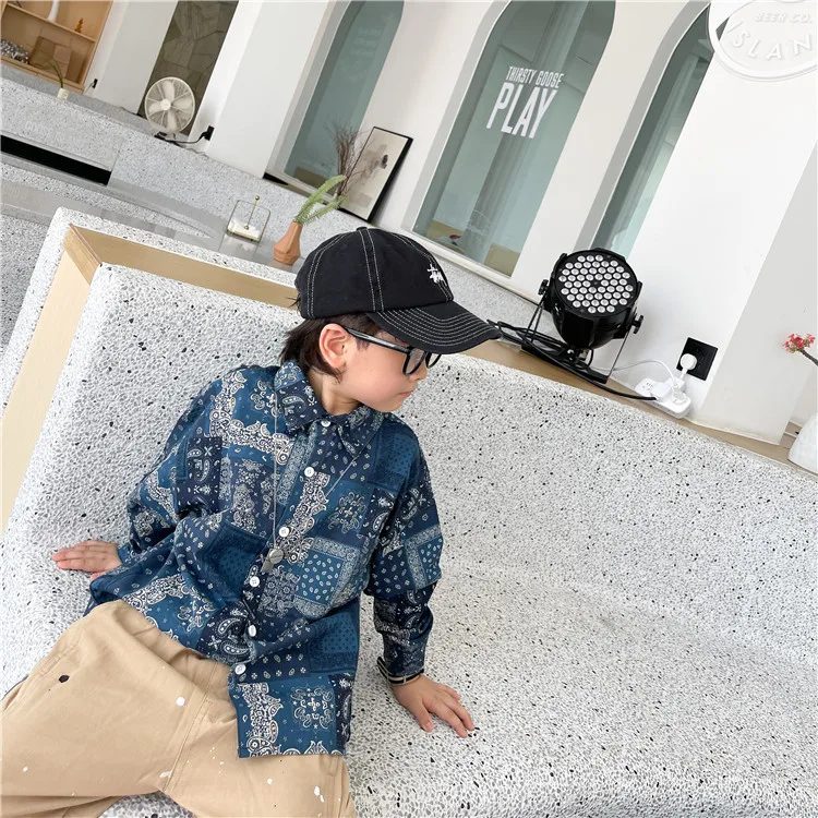 Рубашка для мальчиков; Сезон осень; Новинка 2021 года; Рубашка с цветочным принтом в этническом стиле; Детская Свободная рубашка из потертого хлопка