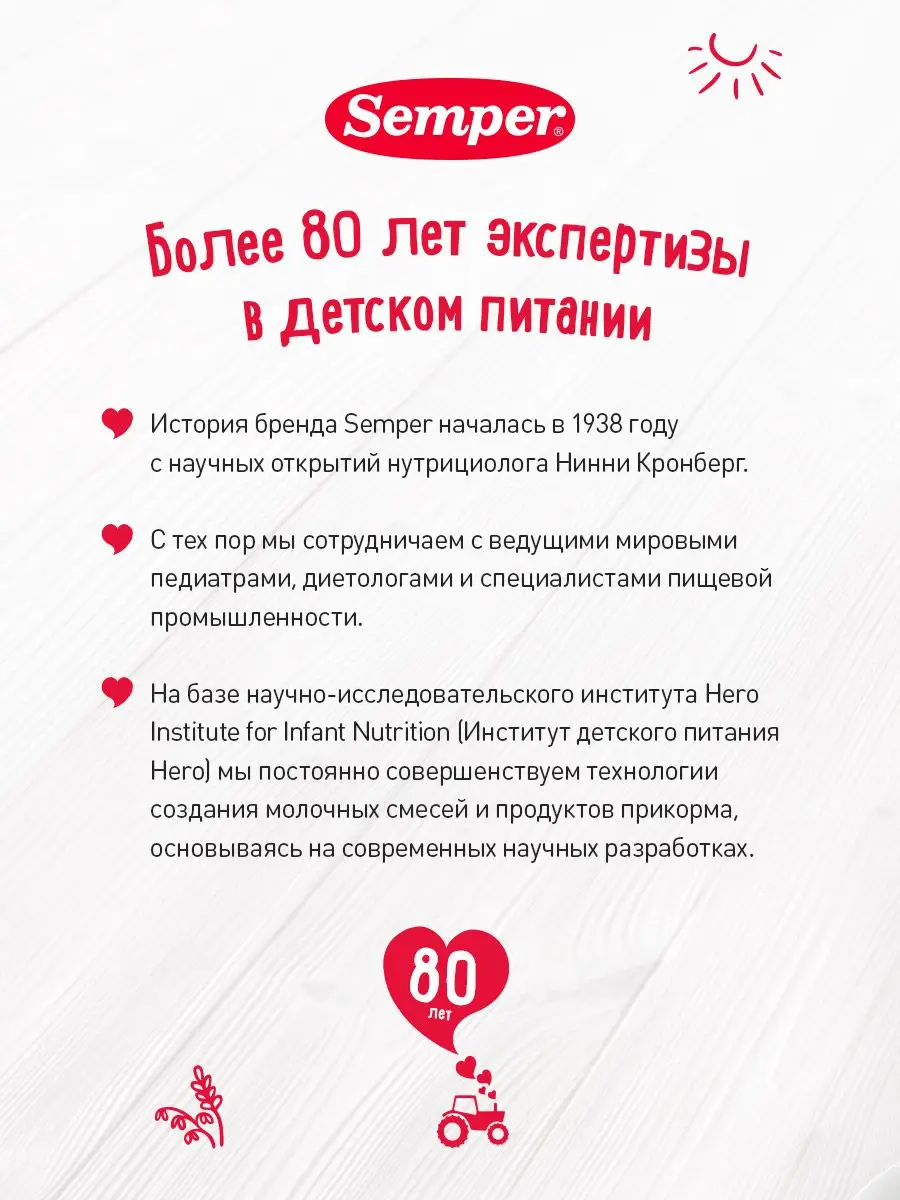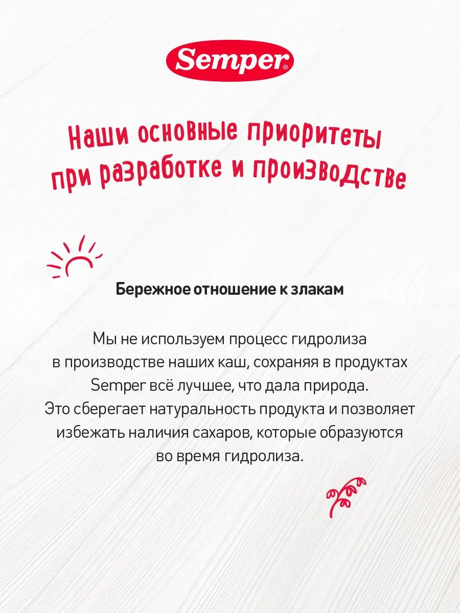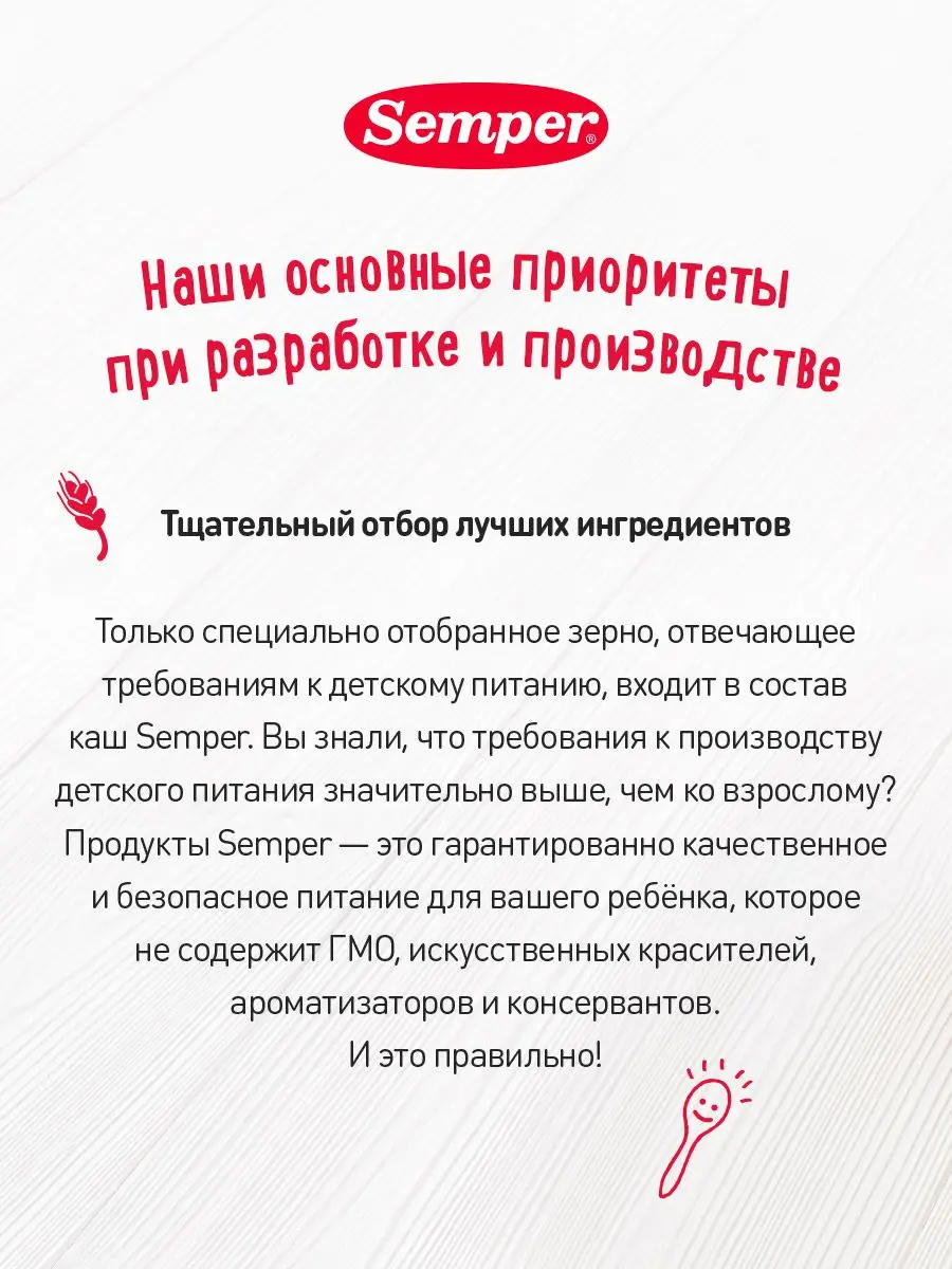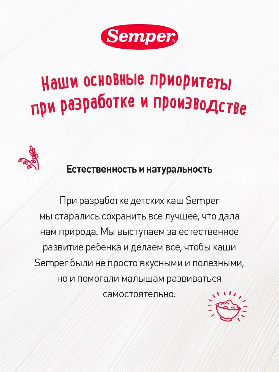 Каши Semper не содержат добавленного сахара и обладают натуральной сладостью молока, злаков, фруктов и ягод, что, в свою очередь, помогает с самого раннего детства формировать привычку к правильному питанию..