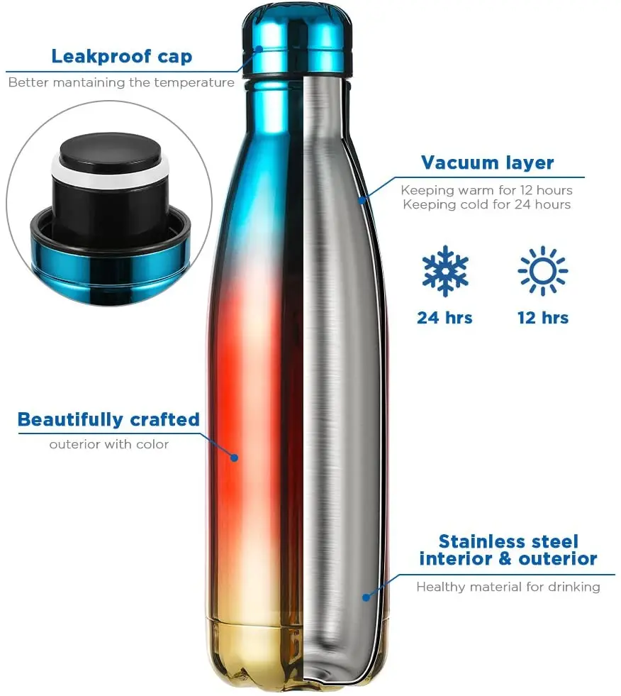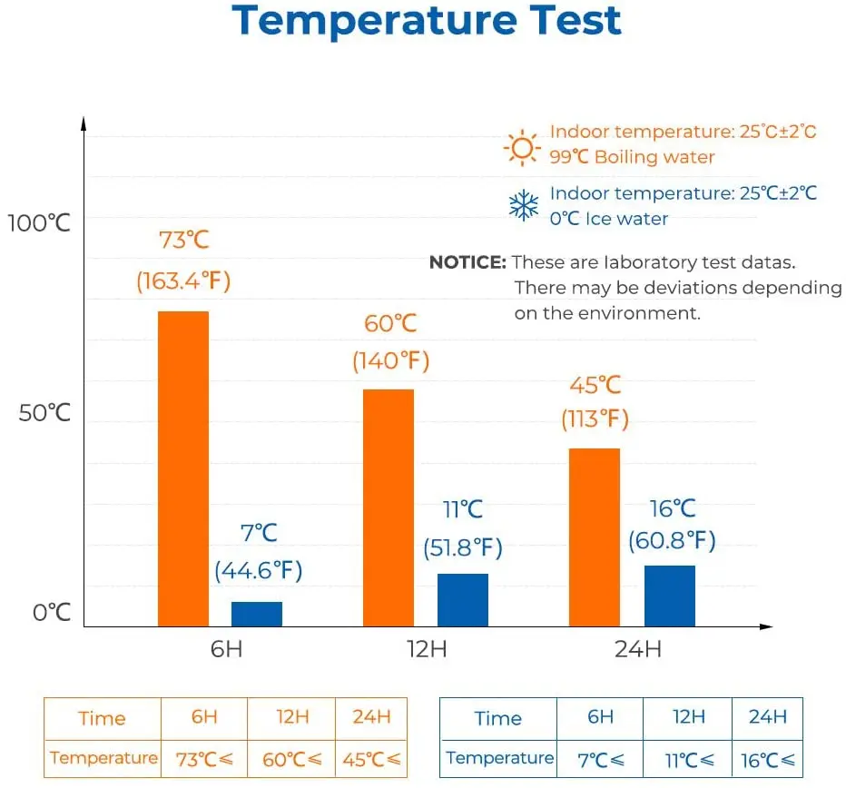 При комнатной температуре 25 ° C ± 2 ° C, через вакуумную изоляцию, на плоской подошве должны быть горячие напитки до 12 часов (диапазон температур в течение 12 часов: от 99 ° C до 60 ° C) и холодные напитки холодными до 24 часов. Диапазон температур в течение 24 часов: от 0 ° C до 16 ° C), только в качестве справки, может варьироваться в различных ситуациях. Кроме того, вышеуказанные вкусы бутылки не более или более горячие.