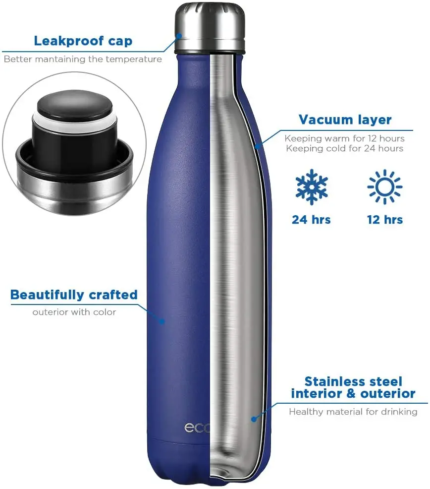 Из бисфенола А, Phthalat, Токсин бесплатно, появления ржавчины 18/10 нержавеющая сталь. Прочный и долговечный. Экологически чистая Спортивная бутылка для воды, которая всегда близка детям и взрослым. Изолирующая бутылка Ecooe не подходит для газированной воды или газированных напитков.