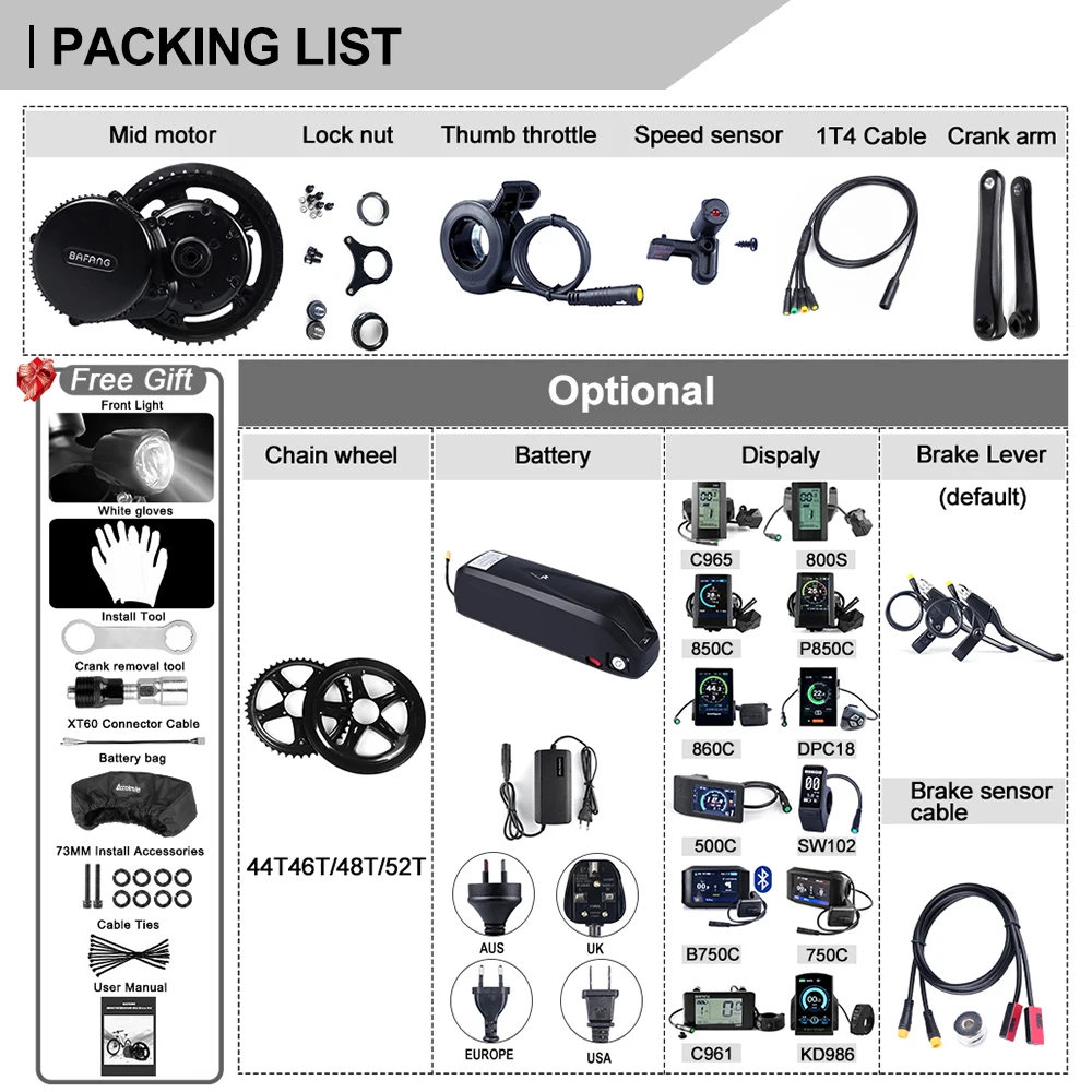 Часто задаваемые вопросы:Как я могу узнать, подходит ли этот двигатель среднего привода для моего велосипеда?Этот средний приводной двигатель подходит для велосипеда с широким нижним кронштейном 68 мм (2,68 дюйма) - 73 мм (2,87 дюйма). Внутренний диаметр кронштейна должен быть не менее 33,5 мм. Мы отправим дополнительные аксессуары для установки для нижнего кронштейна 73 мм.Могу ли я установить двигатель, как только получу его?Перед установкой двигателя, пожалуйста, следуйте инструкциям в Руководстве для подключения двигателя, чтобы узнать, может ли двигатель работать нормально. Если есть проблема, пожалуйста, сначала свяжитесь с нами, мы предоставим техническую поддержку, не волнуйтесь. В комплект входит:1*48V 250W Средний привод двигателя1 пара * тормозные рычаги или тормозные датчики1 пара * рукоятка1 пара * бензопилок (вариант 44T/46T/48T/52T, пожалуйста, оставьте нам сообщение, если вы хотите изменить бензопилу)1 комплект * дроссельная заслонка большого пальца1 комплект * Датчик скорости1 * дисплей (750C Bluetooth(Только поддержка системы IOS),DPC18,860C,P850C (Новый),850C,750C,SW102,500C, 800S,C961Дисплей)1*4 в 1 кабель1 * аксессуары1 * Аккумулятор (опция)1 * зарядное устройство (опция US / EU/ AU / UK)Подарки: 1 шт. 6 в передний светильник + 1 шт. перчатки + 1 шт. ключ для установки инструмента + 1 шт. съемный инструмент для кривошипа + 1 шт. Защитная сумка для аккумулятора + 1 шт. XT60 порт Соединительный кабель для аккумулятора + 1 комплект * Установка аксессуаров для нижней части 73 мм кронштейн + Кабельные стяжки + Руководство пользователя