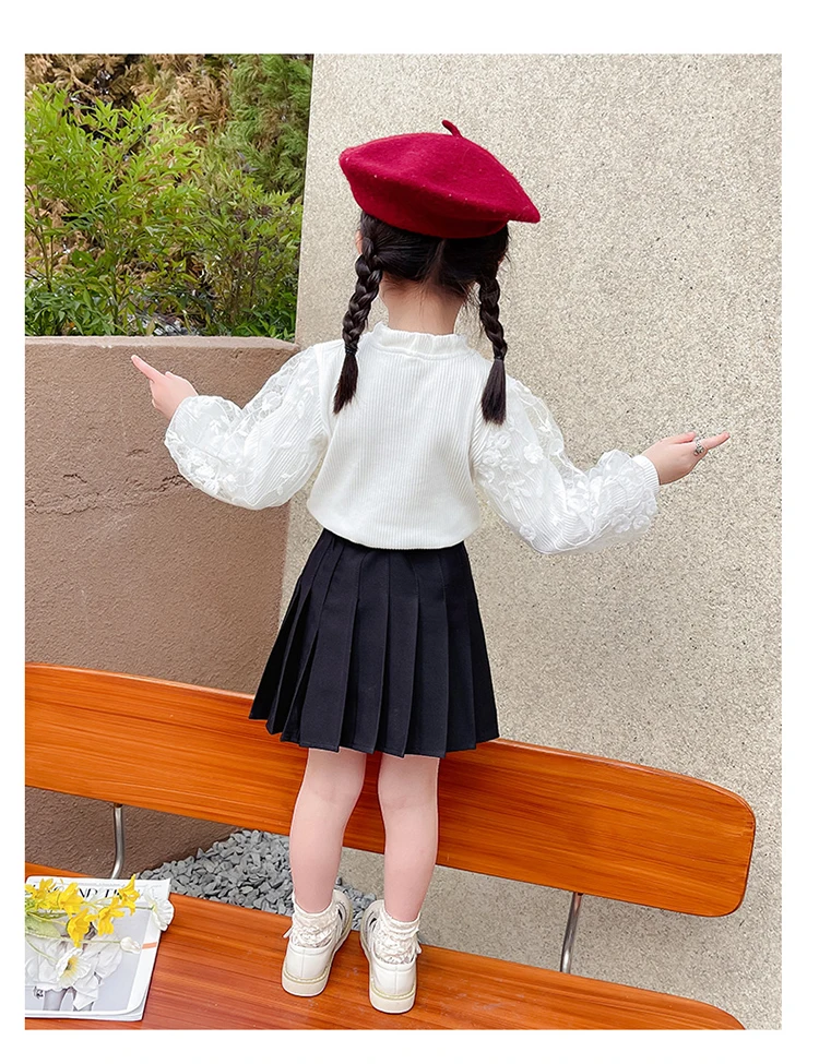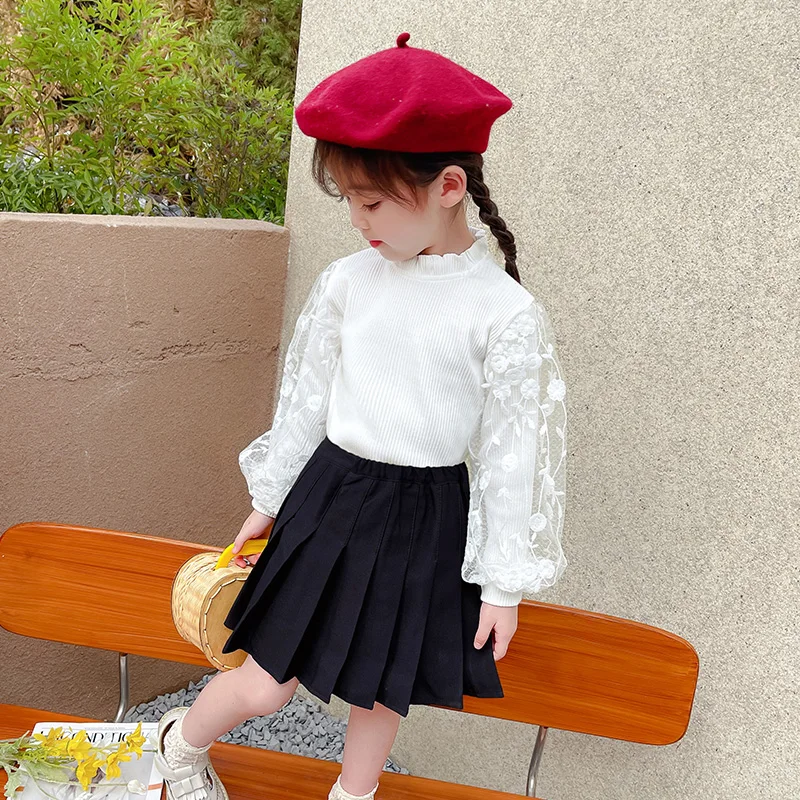 Одежда для маленьких девочек; Белые вязаные пуловеры; Кружевной джемпер с пышными рукавами; Пальто; Свитер; Детская одежда; Сезон весна-осень
