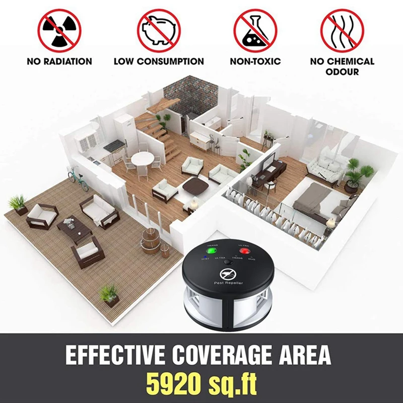 Безопасный и простой в использовании: забудьте о вредных химических веществах, ядах и ловушках, все, что вам нужно сделать, это подключить это устройство, и он начнет выполнять свою работу, чтобы защитить площадь, измеряющую до 5000-6000 кв. ФТ. 360 градусов