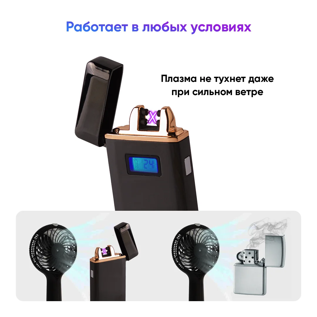 Доп. опции зажигалки: возможность зарядки через USB, cверхпрочный корпус из цинкового сплава, LED дисплей выводящий информацию о количестве прикуриваний и зарядке