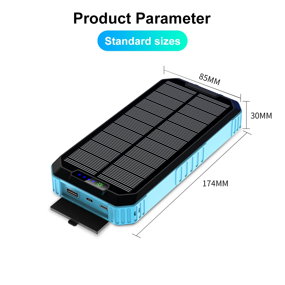 Прочный и прочный дизайн: зарядное устройство на солнечной батарее изготовлено из высококачественного АБС-пластика и силикона, оснащено солнечной панелью, которая является удобным инструментом для кемпинга, велоспорта, рыбалки, путешествий, пешие прогулки и пляжи. IP66 водонепроницаемый, пыленепроницаемый и ударопрочный подходит для различных суровых условий.