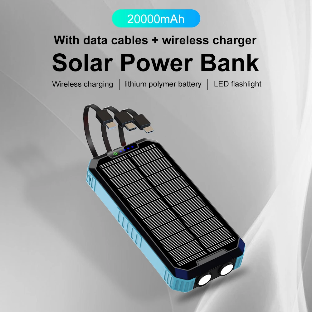 30000mAh Солнечное зарядное устройство: Высокая емкость солнечной энергии банк с 30000mAh большой емкости, Встроенный кабель lightning, микро кабель и кабель типа C, всего три кабеля для всех Мобильный телефон напрямую. Это портативное зарядное устройство без кабеля с беспроводным выходом поддерживает, вам не нужен зарядный кабель.