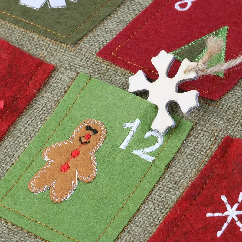 Description NICEXMAS Christmas tree advent calendar makes it fun to countdown to Christmas. Move the marker to each date and place in the pocket to count the days. For more fun, put a treat inside each pocket to enjoy as the days get closer. Its unique design has a Merry Christmas sign on the trunk making it an exclusive. The green, red, golden yellow colors are are saturated and rich. It hangs on the wall a hook on the back. Start a new family holiday tradition with this fun decoration. Features