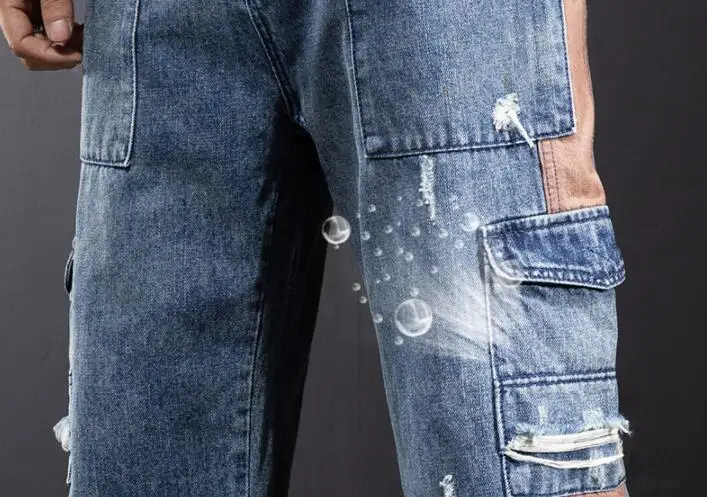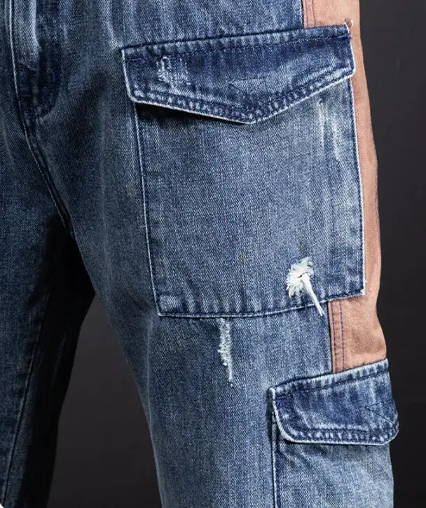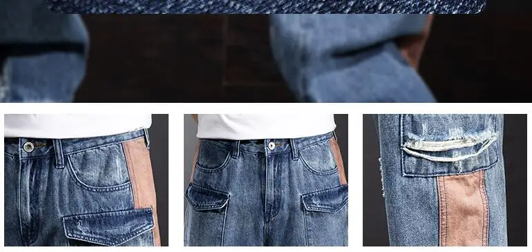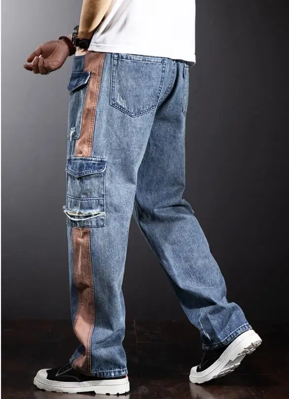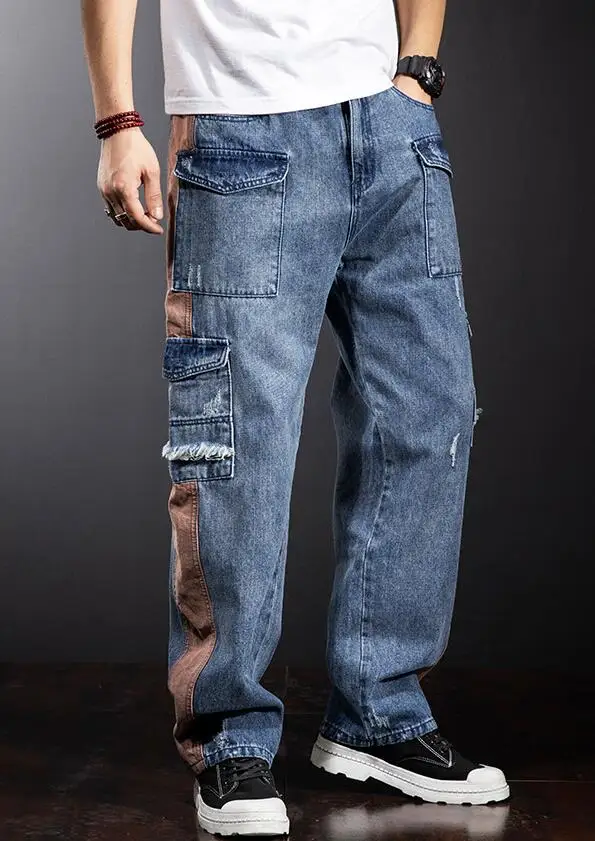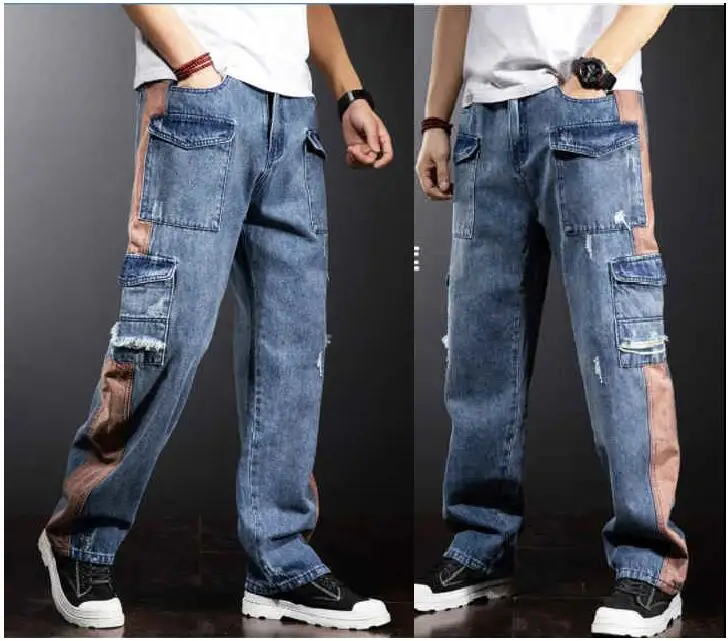 Свободные джинсы-карго с несколькими карманами; Мужские прямые джинсы с широкими штанинами в стиле пэчворк; Очень большие джинсы
