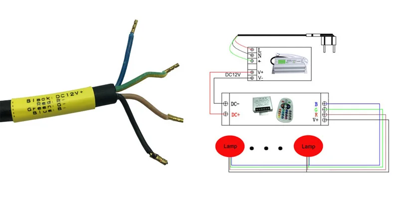 2. Теплый белый и чистый белый в 2 проводах кабеля, цвет RGB в 4 проводах кабеля.