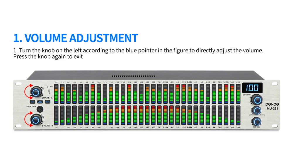 Ручка для регулировки частотного диапазона 20-20K, синий светильник соответствующего частотного диапазона мигает,