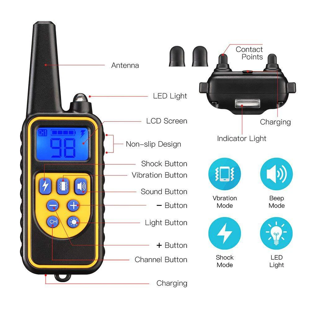 Этот полностью водонепроницаемый электронный ошейник очень популярен среди собак и владельцев домашних животных. Его системы обучения помогут вам контролировать и обучать свою собаку в эффективном диапазоне с помощью серии функций, включая вибрационное оповещение, режим шока и звукового сигнала и т. д. Благодаря удаленному дизайну вы можете удаленно останавливаться, бегать по коррекции, легко перезвонить, кусать и бороться. Это будет ваш хороший помощник для обучения. Подходящая собака: большая собака, собака среднего размера, маленькая собака