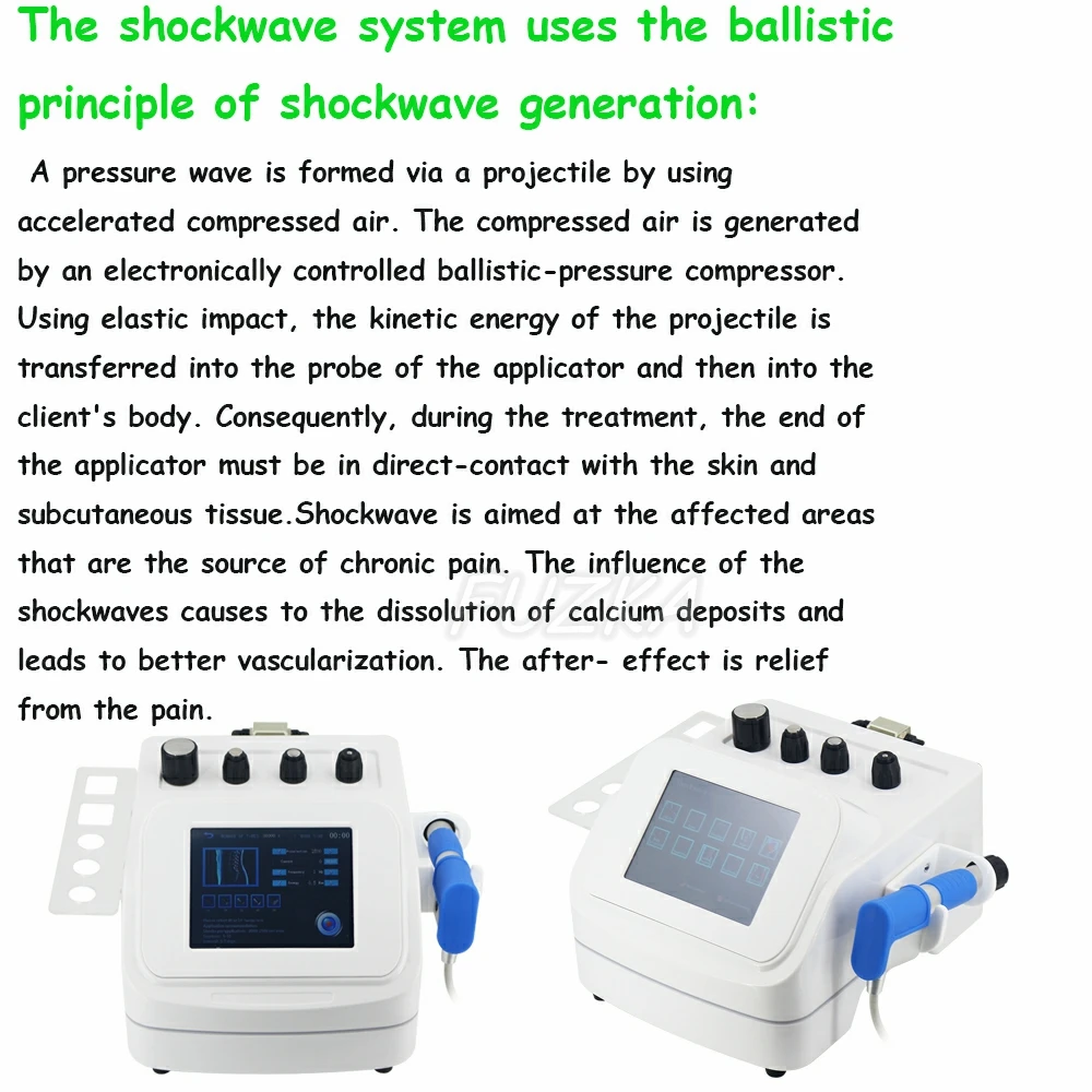 Волна давления образуется через снаряд с помощью ускоренного сжатого воздуха. Сжатый воздух генерируется электронным контролем баллистического давления компрессора. Используя эластичное воздействие, кинетическая энергия снаряда переносится в зонд аппликатора, а затем в тело клиента. Следовательно, во время лечения конец аппликатора должен находиться в непосредственном контакте с кожей и подкожной клетчаткой. Ударная Волна нацелена на пораженные участки, которые являются источником хронической боли. Влияние ударных волн вызывает растворение отложений кальция и приводит к лучшей васкуляризации. Эффект после-облегчение от боли.