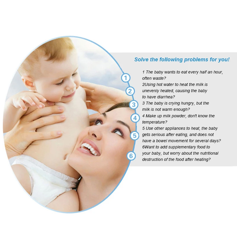 Подходит для разогрева различных типов бутылок молока и детского питания, таких как молоко, каша, рисовые зерна и т. Д. Температура нагрева обычно контролируется в диапазоне от 35 °C до 45 °C. Убедитесь, что пища не кипела и не уничтожает Оригинальное питание.