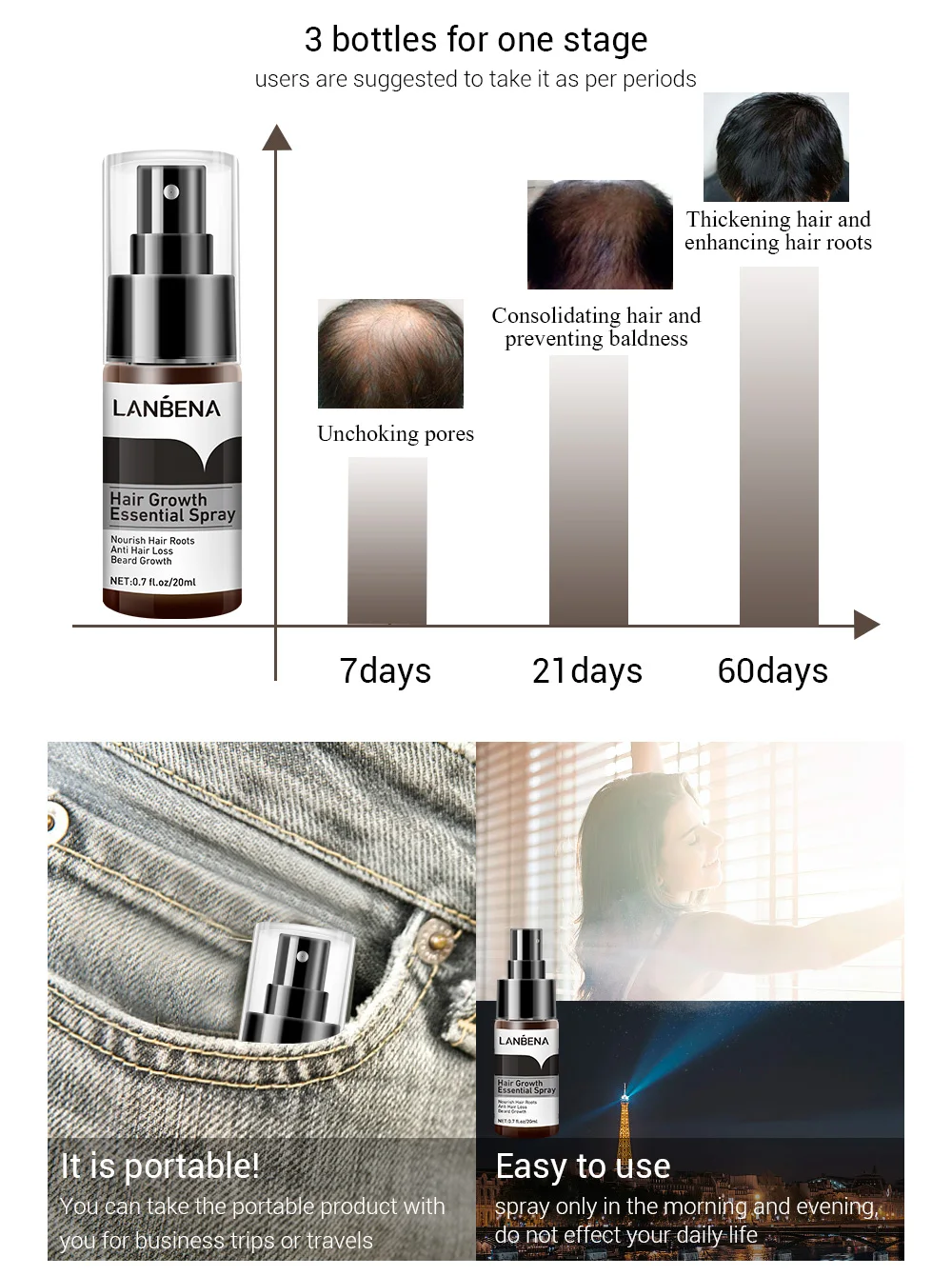 Спрей-эссенция для роста LANBENAИмеет функции ускорения кровообращения на коже головы, улучшения массажа волосяных фолликулов и корней, отек корней волос, содействия синтезу меланина, улучшения качества волос, спрей для роста ланбены (сильная версия) также может помочь вам следующими способами, такими как увеличение эластичности волос, Ускоряет рост волос и тщательно очищает кожное сало пор. Спрей LANBENA ESSENCE для роста эффективен для всех видов выпадения волос, алопеции и алопеции totalis. Это самый эффективный травяной продукт для роста волос.