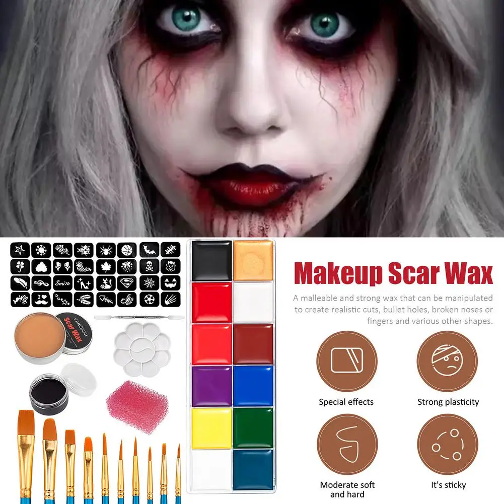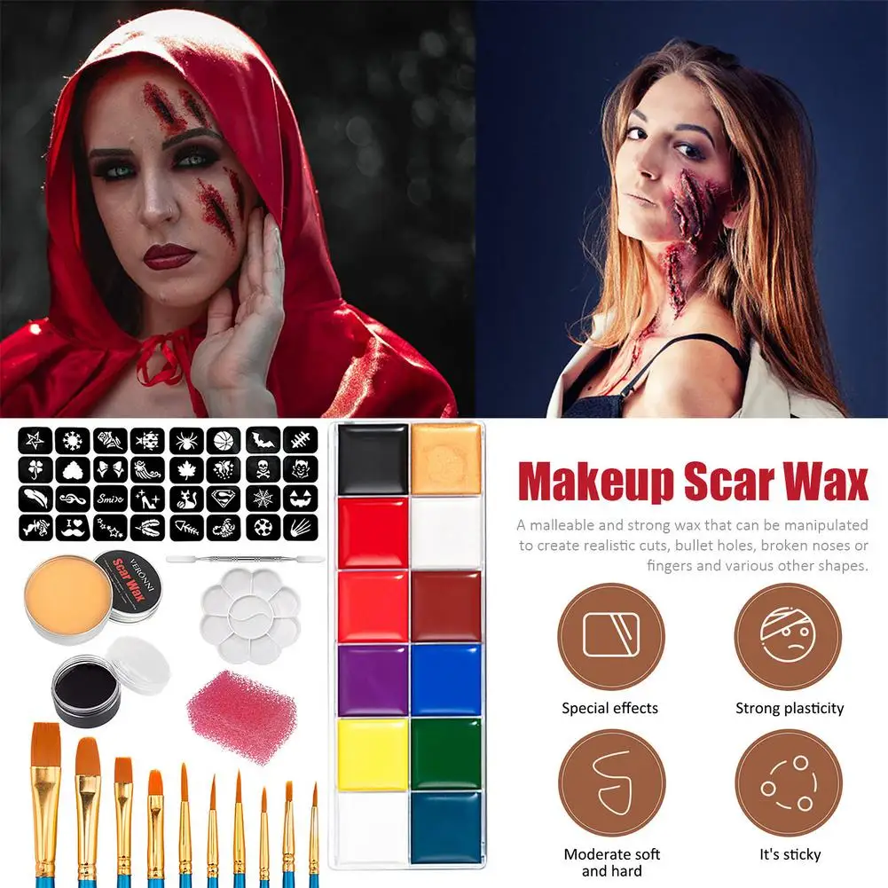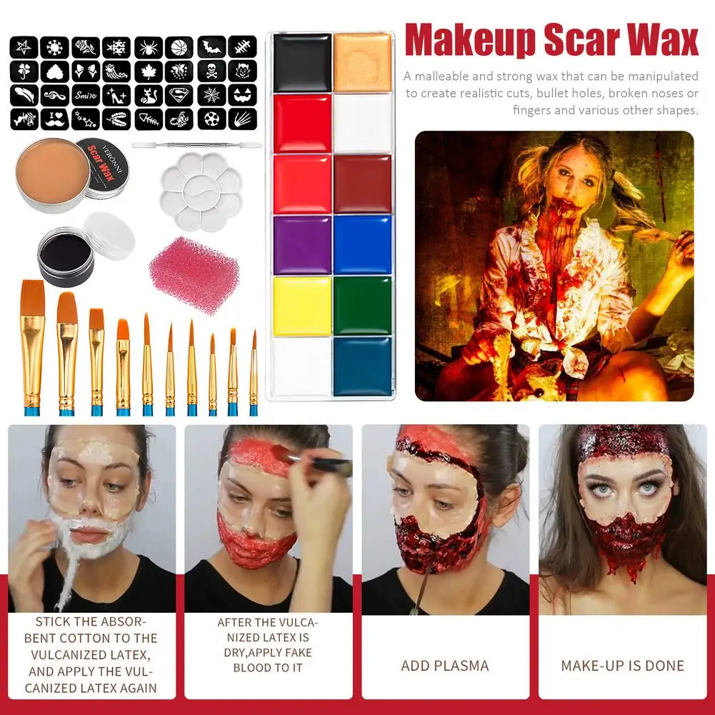 4. Посылка включает в себя: 32 шаблонов. Макияж воск для шрамов 60 грамм, шпатель инструмент, плазма 30 мл, кисть для инструментов 10, губка, краска для тела (12 цветов), лоток для краски.