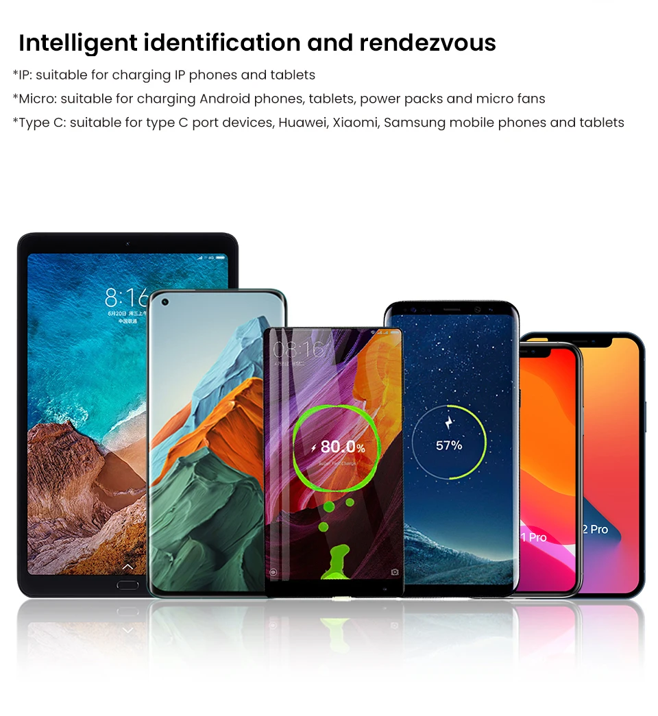 ● Микро-usb Поддержка порта QC3.0 60 Вт Быстрая зарядка ● 3 цвета и легко распознает ● 8-Pin Поддержка порта 20 Вт Для iPhone 13 12 серии ● Тип c Поддержка порта 3 A PD 60W Быстрая зарядка ● Мульти-порт: Type-c-type-c/8-Pin/Micro USB