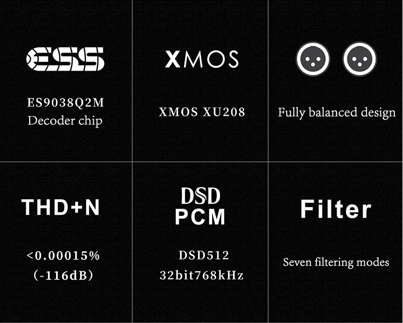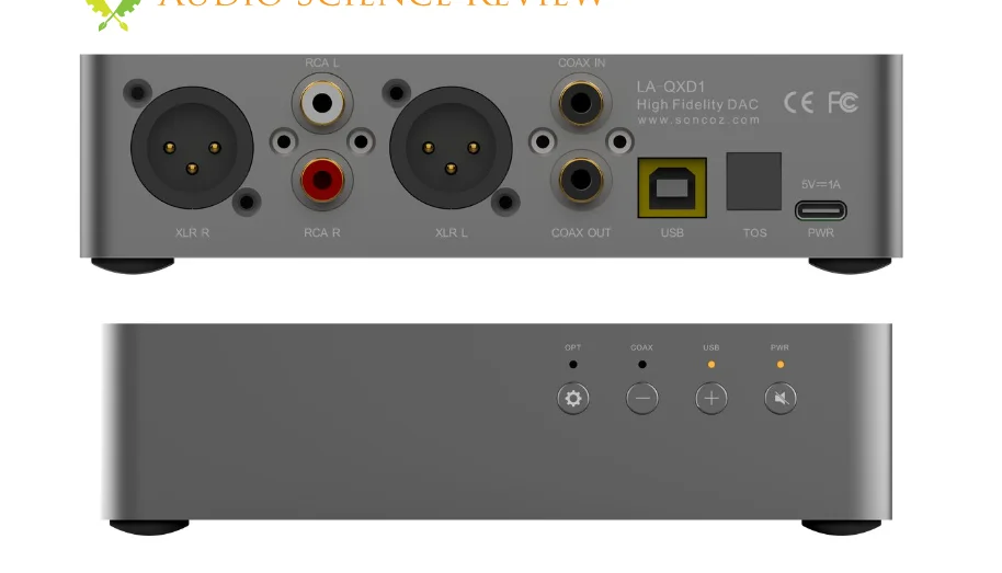 ES9038Q2M Hi-Res DAC: декодирующий чип SONCOZ LA-QXD1-это флагманский чип ES9038Q2M ESS. Чип обработки USB XMOS XU208. Максимальная частота дискретизации под входом USB DAC поддерживает DSD512, PCM 32 бит/768 кГц. Оптоволоконный коаксиальный поддерживает до 24 бит/192 кГц.