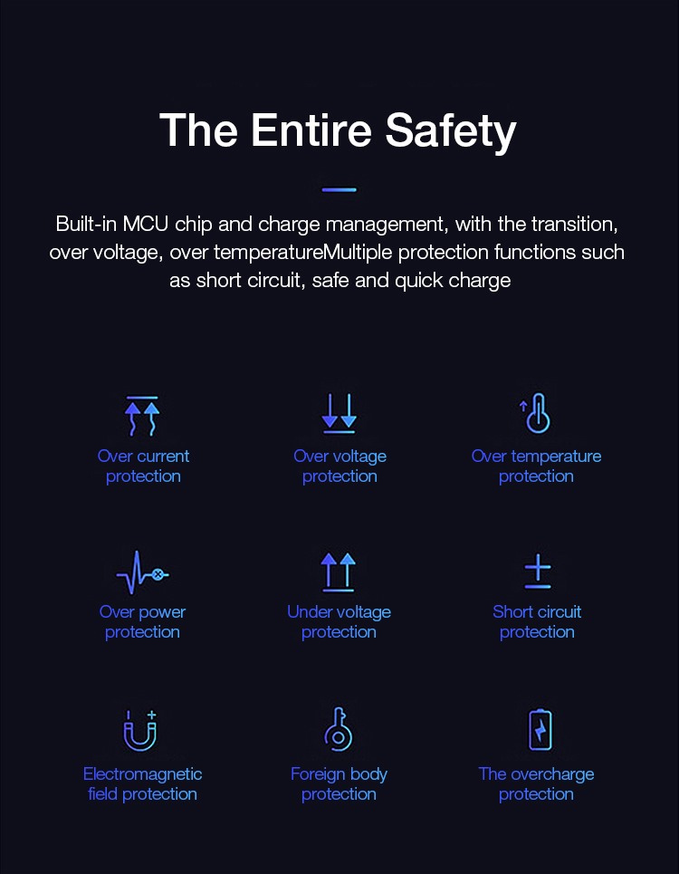 Built-in MCU chip and charge management, with the transition, over voltage, over temperature Multiple protection functions such as short circuit, safe and quick charge