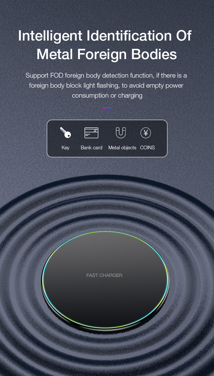 Support FOD foreign body detection function, if there is a foreign body block light flashing, to avoid empty power consumption or charging