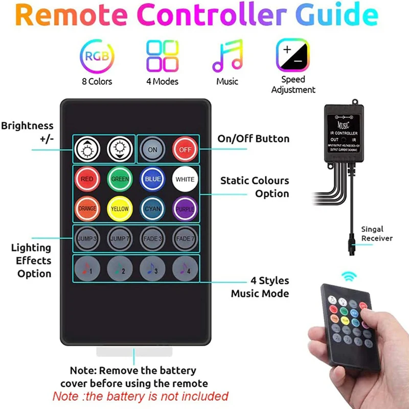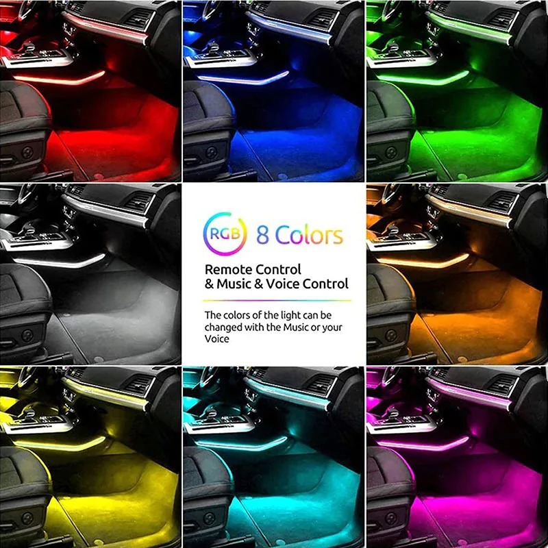 Удаленный музыкальный ритм атмосферный свет Особенность:1) абсолютно новый и качественный2) Это около одного набора светильник льников, включая 4 светильник, один прикуриватель и один пульт дистанционного управления.3) Простой дизайн для красивого, экзотического и романтичного интерьера.4) для установки доступен двусторонний клейкий кран.5) можно использовать на полу салона автомобиля или приборной панели.6) Удаленная Функция: вкл/выкл, изменение цвета, изменение мигающего рисунка, изменение скорости движения, режим ритма музыки (с миганием музыкального ритма). 7) 4 шт. Автомобильные светодиодные ленты RGB, светодиодные ленсветильник s цветов, декоративные атмосферные лампы для стайлинга автомобилей, светильник автомобиля с пультом ДУ Характеристики:1) Напряжение: 12 В постоянного тока2) светодиодный да: 50503) Длина световой линии: два из них 67 дюймов (1700 мм), два других-46 дюймов (1180 мм)4) Длина линии прикуривателя: 0,55 м5) Цвет света: насыщенный цвет (цвет s можно установить с помощью пульта дистанционного управления)6) Установка: Поместите прикуриватель напрямую в гнездо прикуривателя без модификации проводов. 7) Мы не поставляем картонную коробку для этого продукта, мы надежно защитим его пузырчатой пленкой, если вам нужна картонная коробка, пожалуйста, свяжитесь со мной перед заказом. Спасибо 8) Примечание: пульт дистанционного управления не входит в комплект, если у вас есть какие-либо вопросы, вы всегда можете связаться с нами. Посылка входит:1 комплект (4 шт.) Светодиодные Автомобильные RGB светодиодные атмосферные огни + радиочастотный контроллер Примечание: батарейка в комплект не входит. (Изделие не может перевозить аккумулятор из-за транспортировки самолета) (Спецификация батареи: CR2025 и CR2032)