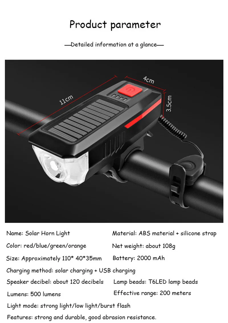 Характеристика: 1. Велосипедный головной светильник s use T6 светодиодный ламповый бисер, максимум 500 люменов (эффективное расстояние 600 футов) передний велосипедный светильник s, супер яркий, 3 режима и светильник восприятие режим управления (светильник s Автоматическое включение/выключение), нажмите на кнопку, чтобы изменить режим. 2. Источник питания: Генерация солнечной энергии и зарядка через USB (вход USB). С солнечной панелью, он может быть автоматически заряжен на солнце. Встроенный литий-ионный аккумулятор высокого качества 2000 мАч, экологически чистый, экономит деньги, безопасный и эффективный. 3. Светодиодный фонарь T6: высокая яркость, Дальняя съемка, 200 метров дальняя съемка, Дальняя, более четкая, Безопасная езда. 4. Режим освещения: три вида режимов освещения, опционально, более удобный и разнообразный. 5. Громкоговоритель: громкоговоритель 120 дБ с высокой подачей для обеспечения безопасности вашего путешествия. Встроенный динамик-5 звуков, громкий динамик 120 дБ, длительное нажатие в течение 5 секунд, чтобы изменить мелодию звонка. 6. Водонепроницаемость: Не бойтесь дождя, дождя или тумана. Спецификация: Название: лампа солнечного света для велосипеда с рожком Материал: АБС + силиконовый ремешок Цвет: красный/синий/зеленый/оранжевый Вес: около 145 г Размер: около 110*40*35 мм Аккумулятор: 2000 мАч Способ зарядки: солнечная зарядка + USB зарядка Громкоговоритель дБ: около 120 дБ Бусины лампы: T6 светодиодный бисер Эффективный диапазон: 200 м Светильник ing режим: сильный светильник Высокий/низкий светильник/Строб Особенности: прочный и прочный, хорошая износостойкость Зарядка через USB: быстрая зарядка, удобная зарядка, полное автоматическое отключение, резиновая защитная втулка на интерфейсе может предотвратить попадание пыли и дождя. Солнечная зарядка: удобная зарядка и Аварийная зарядка. Посылка: 1 * роговой светильник, головной светильник 1 * монтажное основание Примечания: 1. Пожалуйста, учитывайте разницу в 1-3 см из-за ручного измерения и 3-5 г из-за разницы между разными цветами. 2. Из-за разницы в цвете экрана цвет может немного отличаться от того, что вы ожидаете, пожалуйста, учитывайте это.