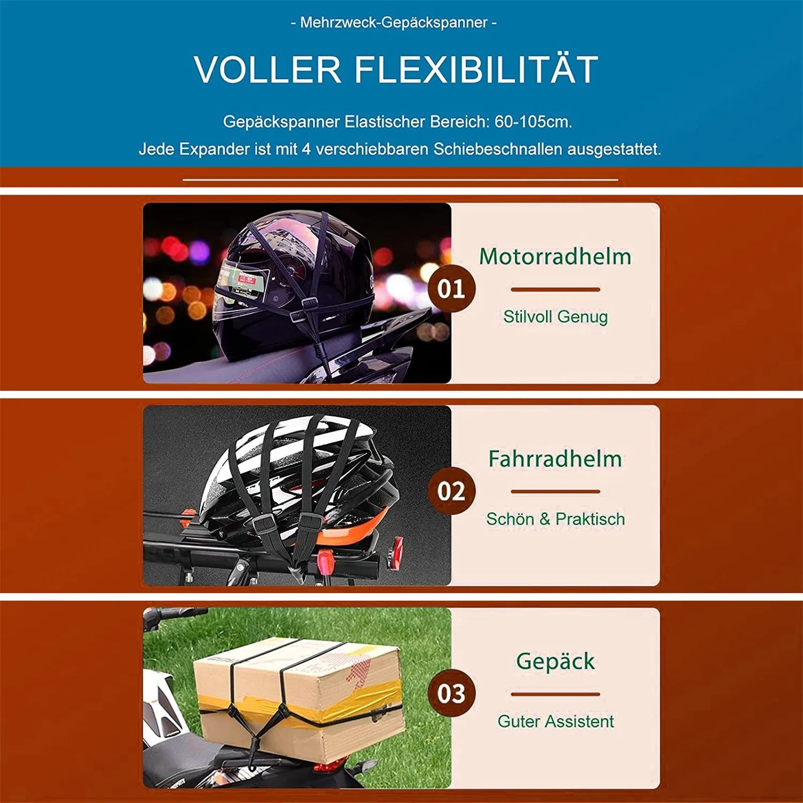 Каждый Расширитель оснащен 4 скользящими ползунками. Вы можете легко настроить Ветви эластичной веревки, перемещая пряжку так, чтобы она покрывала Кривизна шлема и багажа.