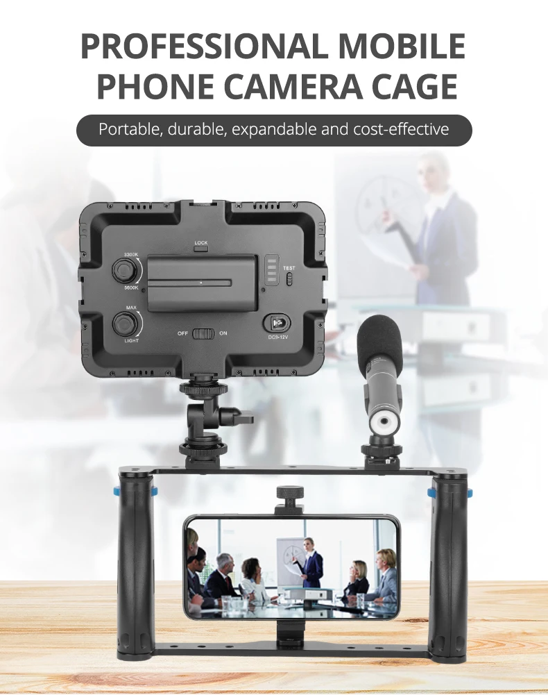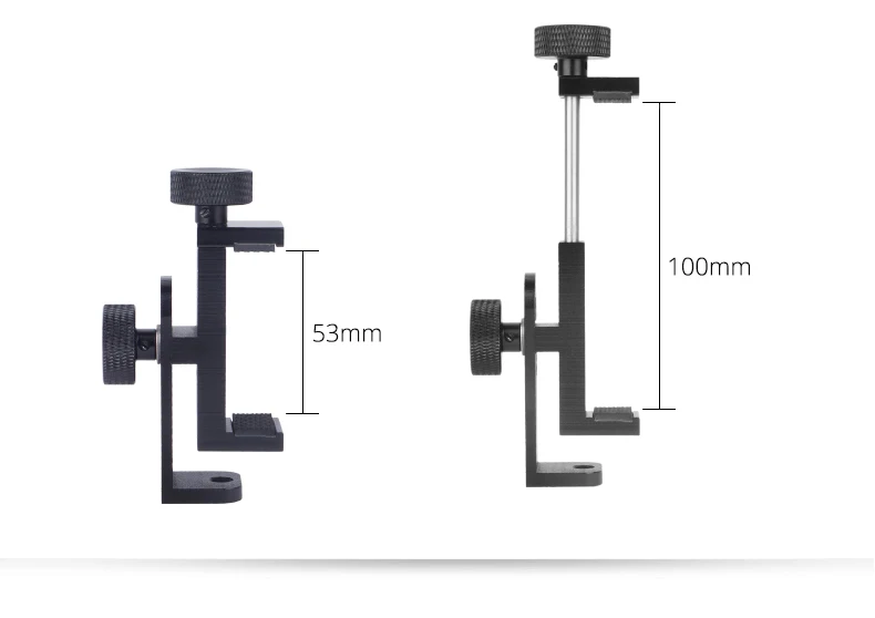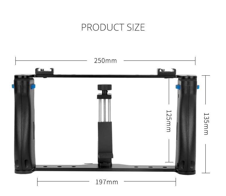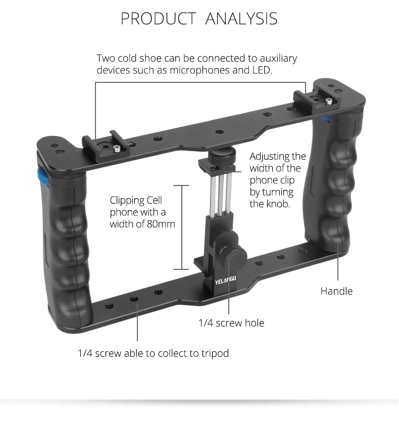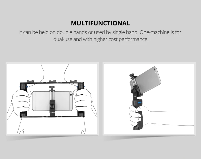 Верхние и нижние опоры и зажимы для телефонов изготовлены из высококачественного алюминия, который более прочный и долговечный. Держатель для телефона может быть мобильный телефон Размеры под 6,6 дюймов. И может вращать угол. Двойные ручки снимаются и могут быть объединены в несколько режимов для творческой съемки.