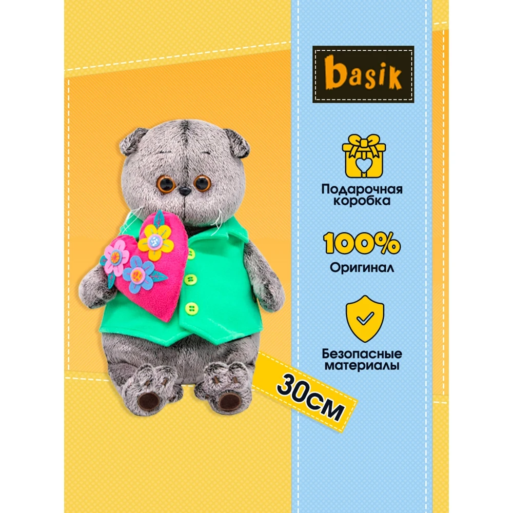 | Аннотация | Кот в мягком жилете из флиса цвета весеннего бутона, в лапках держит розовое сердечко из флиса ручной работы. Сердечко украшено крупными цветами из фетра различных оттенков. Кот Басик — галантный вислоухий шотландец с трогательными глазками и усиками-ниточками, торчащими во все стороны. По задумке дизайнера глазки у Басика разного размера, чтобы взгляд был мультяшно удивленным. Дымчатый шотландец «живет» в коробке-переноске, изготовленной из плотного крафт-картона. Очень презентабельно и стильно! Как любому породистому коту, Басику положен паспорт. И он имеется на обратной стороне коробки. Составлен с юмором и вызывает улыбку. Характеристики: