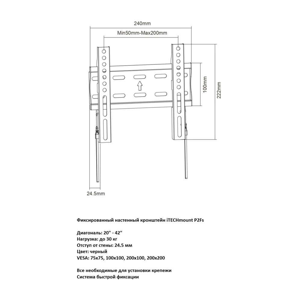 Фиксированный настенный кронштейн iTECHmount P2Fs позволит надежно и без лишних затрат закрепить телевизор диагональю от 20" до 42" и весом до 30 кг на стене Вашего дома или офиса. Фиксированный отступ от стены данной модели составляет всего 24.5 мм, что делает данный кронштейн одним из самых тонких в своем классе.
