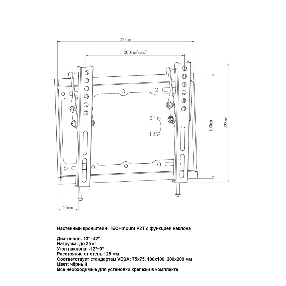 Настенный кронштейн iTECHmount P2T с функцией наклона позволит надежно и без лишних затрат закрепить телевизор диагональю от 13"до 42" и весом до 35 кг на стене Вашего дома или офиса. Фиксированный отступ от стены данной модели составляет всего 25 мм, что делает эту модель одной из самых тонких на рынке. Функция наклона данной модели кронштейна позволит зафиксировать телевизор под углом до 12° вниз.