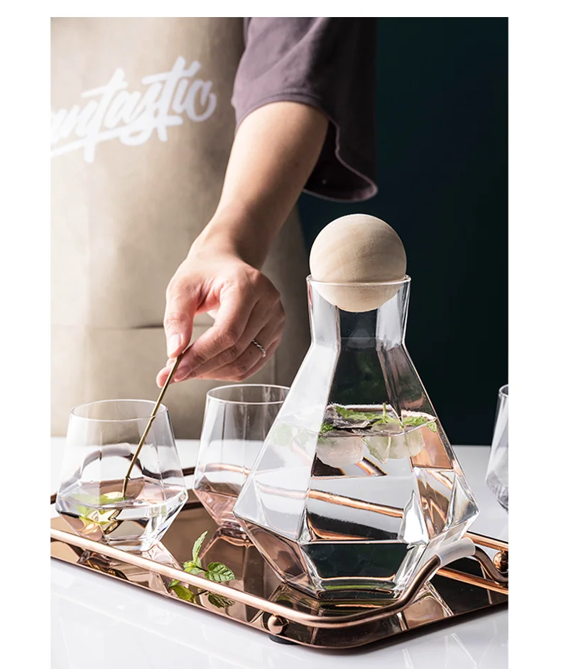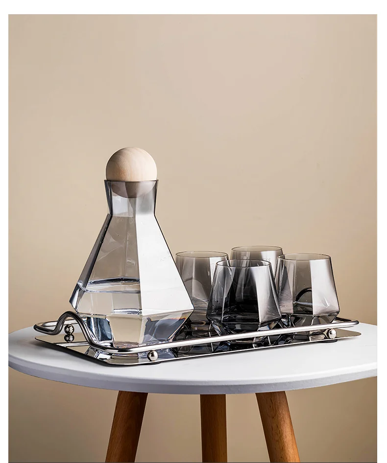 Ни один человек не может устоять перед искушением этого великолепного водного набора. Уникальный дизайн включает в себя Модные элементы. Форма корпуса графина Классическая и Бриллиантовая мода. Сотрудничество с идеальной сферической крышкой из золы служит иллюстрацией вдохновения искусства. Графин поставляется с 4 очками. Очки имеют хорошую прозрачность. Все эти элементы-это комбинированная концепция минимализма и моды.