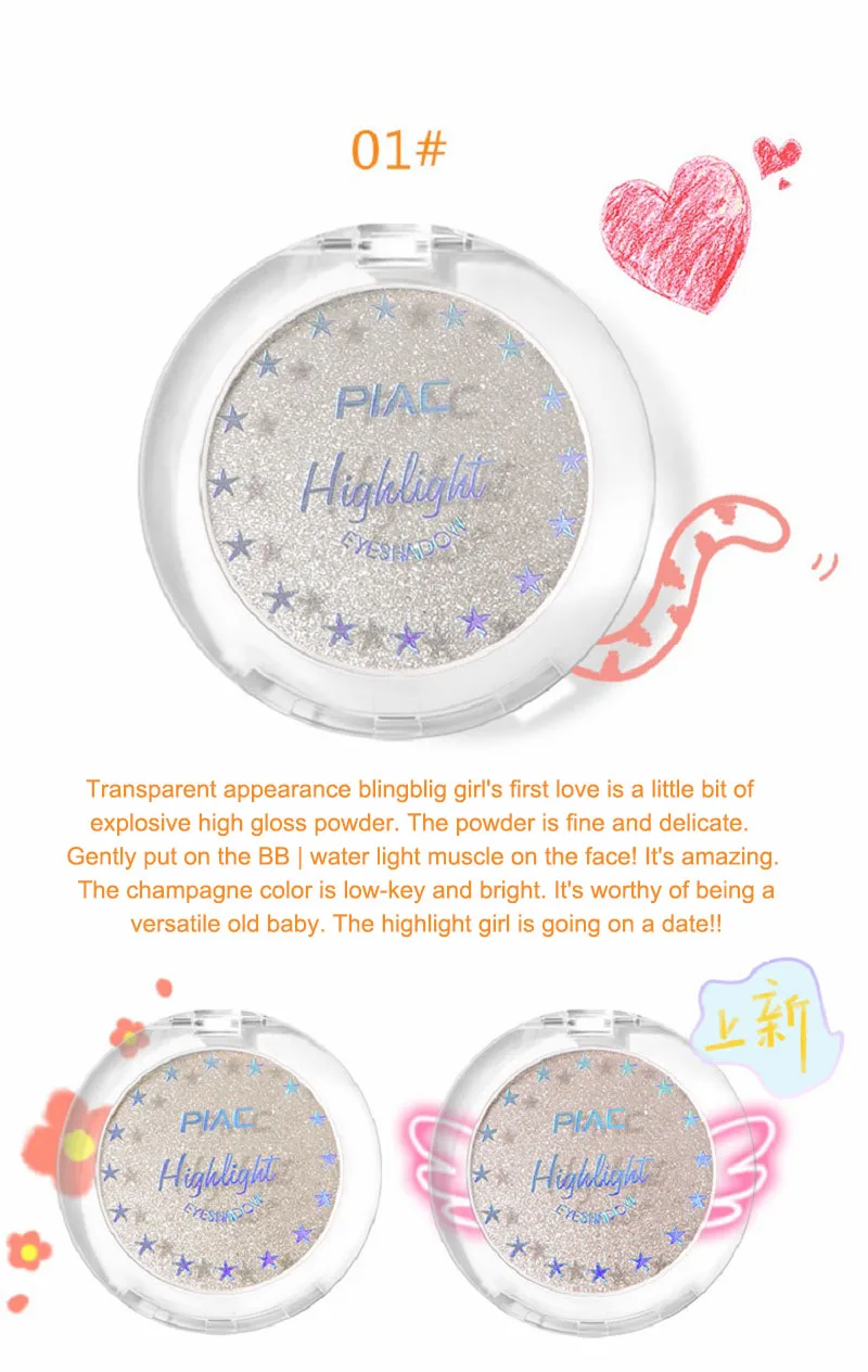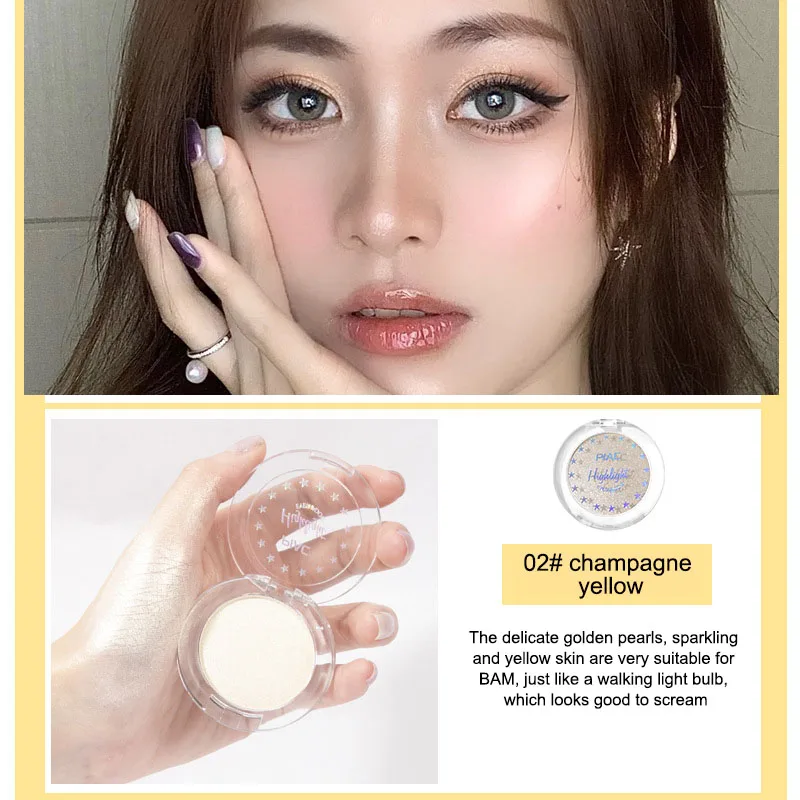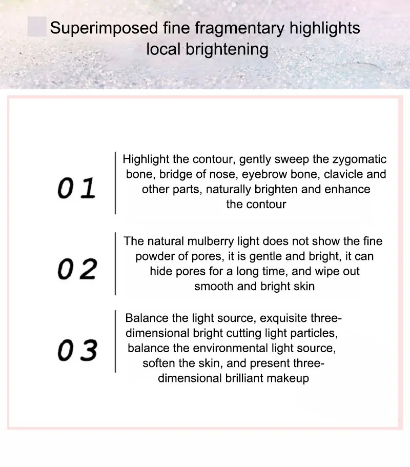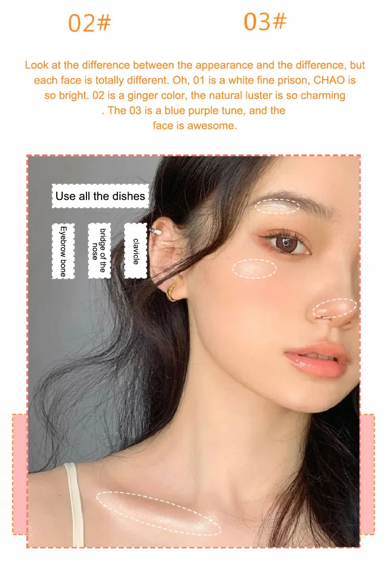T-zone, zygomatic мышца яблока, кончик носа, подбородок, лежа шелкопряда и т. Д., делают лицо блестящим и полным, и его также можно использовать в качестве тени для век, накладываемой осветлением.