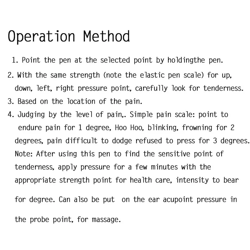 Способ работы 1. Поместите ручку в выбранную точку, удерживая ручку. 2. С такой же прочностью (обратите внимание на эластичную шкалу ручки) для вверх, вниз, влево, вправо точки давления, внимательно посмотрите на нежность. 3. В зависимости от местоположения боли. 4. В зависимости от уровня боли. Простая шкала боли: точка, чтобы выдержать боль в течение 1 градуса, Hoo, мигание, хмуриться в течение 2 градусов, боль трудно уклониться от нажима в течение 3 градусов. Примечание: после использования этой ручки, чтобы найти чувствительную точку нежности, нанесите давление на несколько минут с подходящей точкой прочности для ухода за здоровьем, интенсивность будет иметь степень. Также можно положить на акупунктурные точки ушной раковины давление в точку зонда, для массажа.