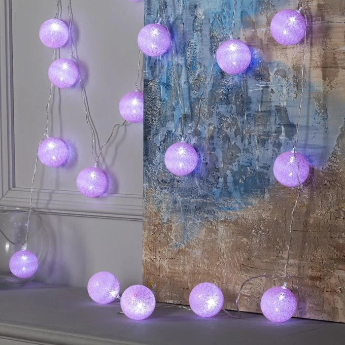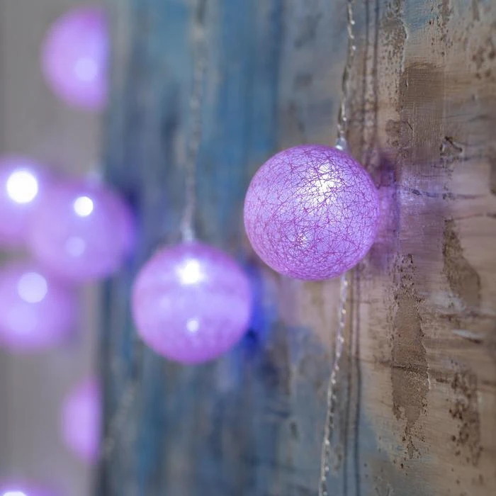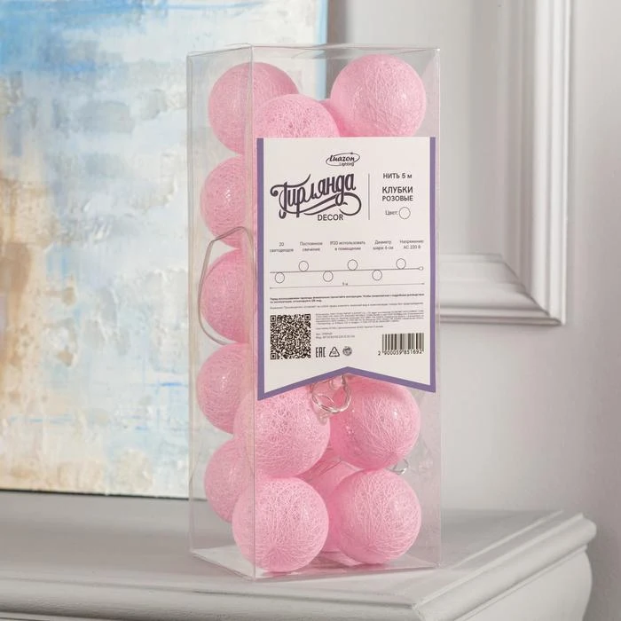 Гирлянда Нить 5 м с насадками Клубки розовые, IP20, прозрачная нить, 20 LED, свечение белое, фиксинг, 220 В