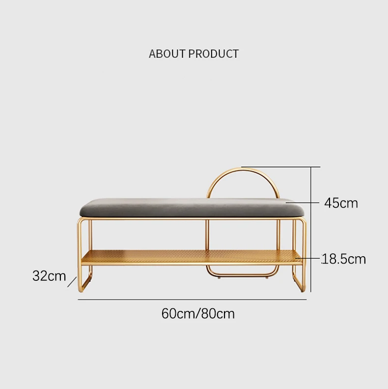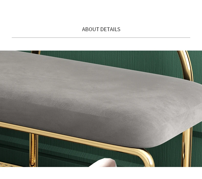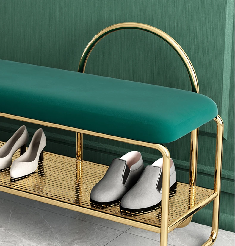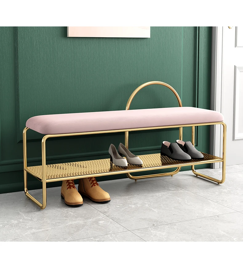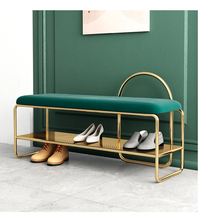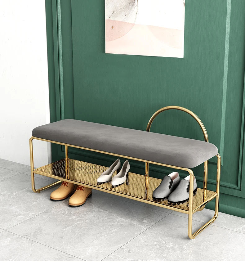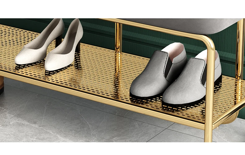 Стул для смены обуви в скандинавском современном стиле, простые линии подчеркивают модный дизайн и отсеки разработаны с полыми сетками, которые четко слоистые и хорошо расположены. Элегантное золото, подчеркивает стиль.
