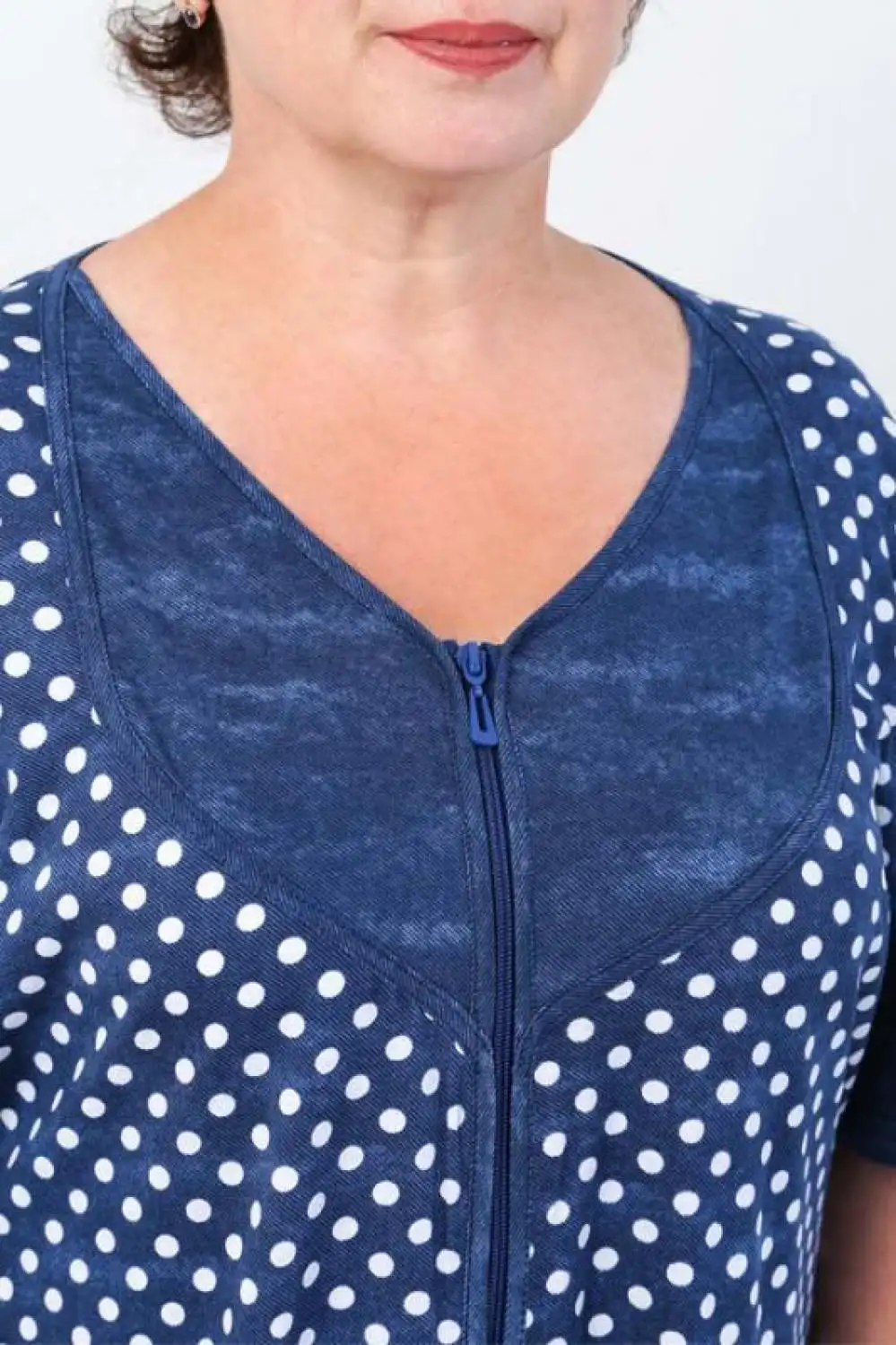 Халат женский полуприлегающего силуэта из трикотажного полотна «кулирка» длинной до уровня колена. На полочке присутствуют накладные карманамы. Рукав втачной базового покроя короткий. Вырез горловины О-образный. Изделие на молнии. Параметры модели: Размер - 50 Рост - 162 см Обхват груди - 109 см Обхват талии - 94 см Обхват бедер - 108 смХарактеристики