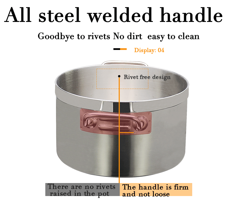 1. Корпус кастрюли для супа с двойным дном изготовлен из сверхтолстой и высококачественной нержавеющей стали, которая растягивается и складывается в один кусок. Небольшой магнетизм будет генерироваться в процессе прессования машины, что является нормальным явлением;