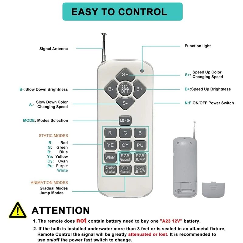 [Яркие цвета] Существует 15 режимов программирования, а светодиодный светильник для бассейна имеет 7 статических режимов и 8 динамических режимов. Есть 2 способа изменить цвет этой лампы бассейна. 1. Используйте переключатель, чтобы заменить светильник бассейна. 2. Используйте вариант на пульте дистанционного управления (батарея не входит в комплект), тип батареи: 23A 12V, если лампа под водой более 3 футов (около 91,4 см) или запечатана в цельнометаллической лампе, сигнал будет Значительно уменьшен или потерян).