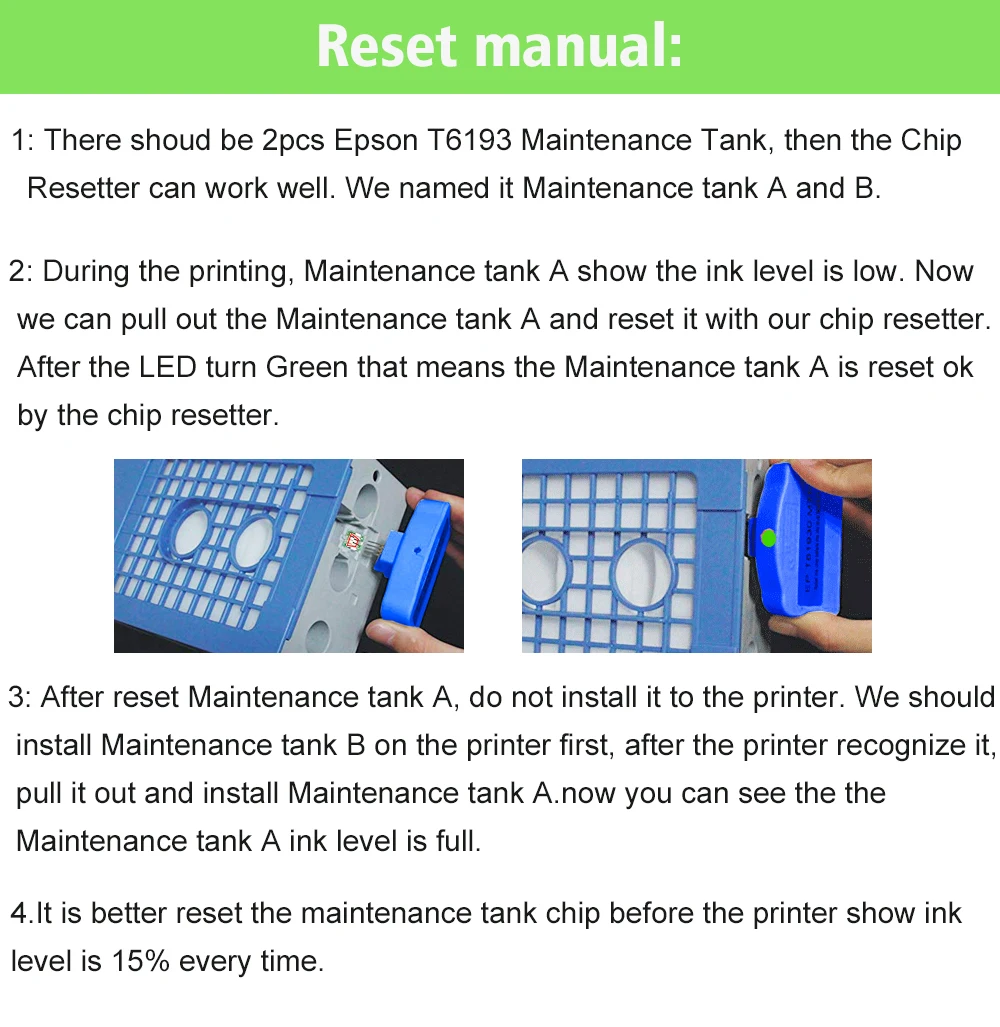2: Этот сброс предназначен только для сброса чипа резервуара для обслуживания, а не для сброса оригинальных чернильных картриджей.