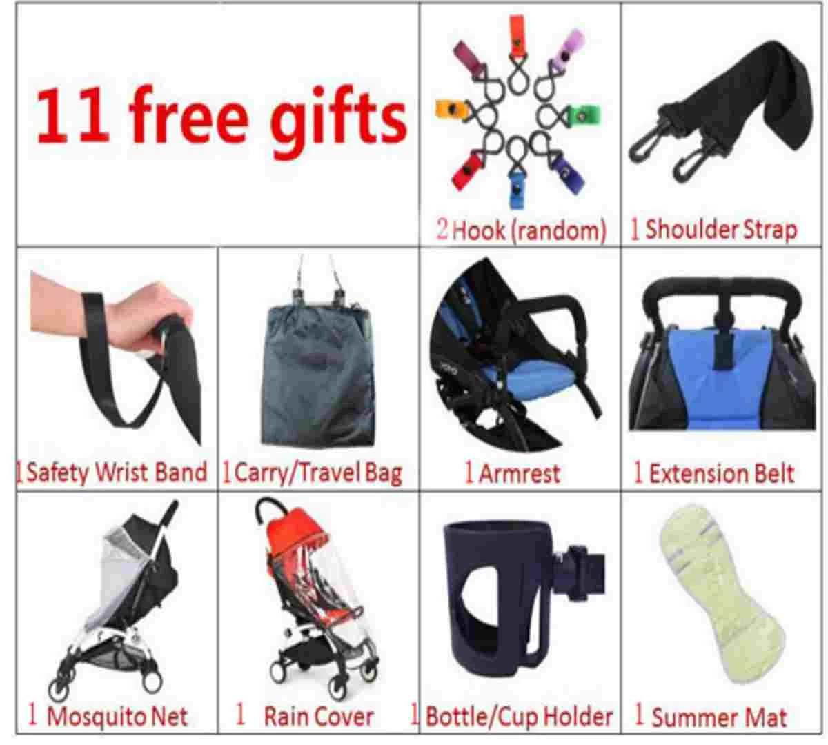 (Коврик из хлопка, летний коврик, москитная сетка, подстаканник, ремешок на запястье, сумка для хранения, дождевик, подлокотник ..) , все коляски имеют белую раму и черную раму