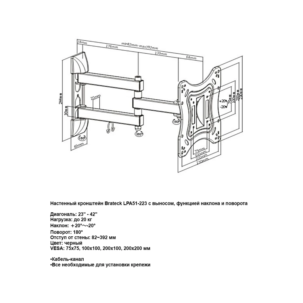 Аннотация | Диагональ: 26" - 42"Нагрузка: до 25 кгНаклон: +20°~-20°Поворот: 180°Отступ от стены: 82-392 ммVESA: 75x75,100x100,200x100,200x200 мм |