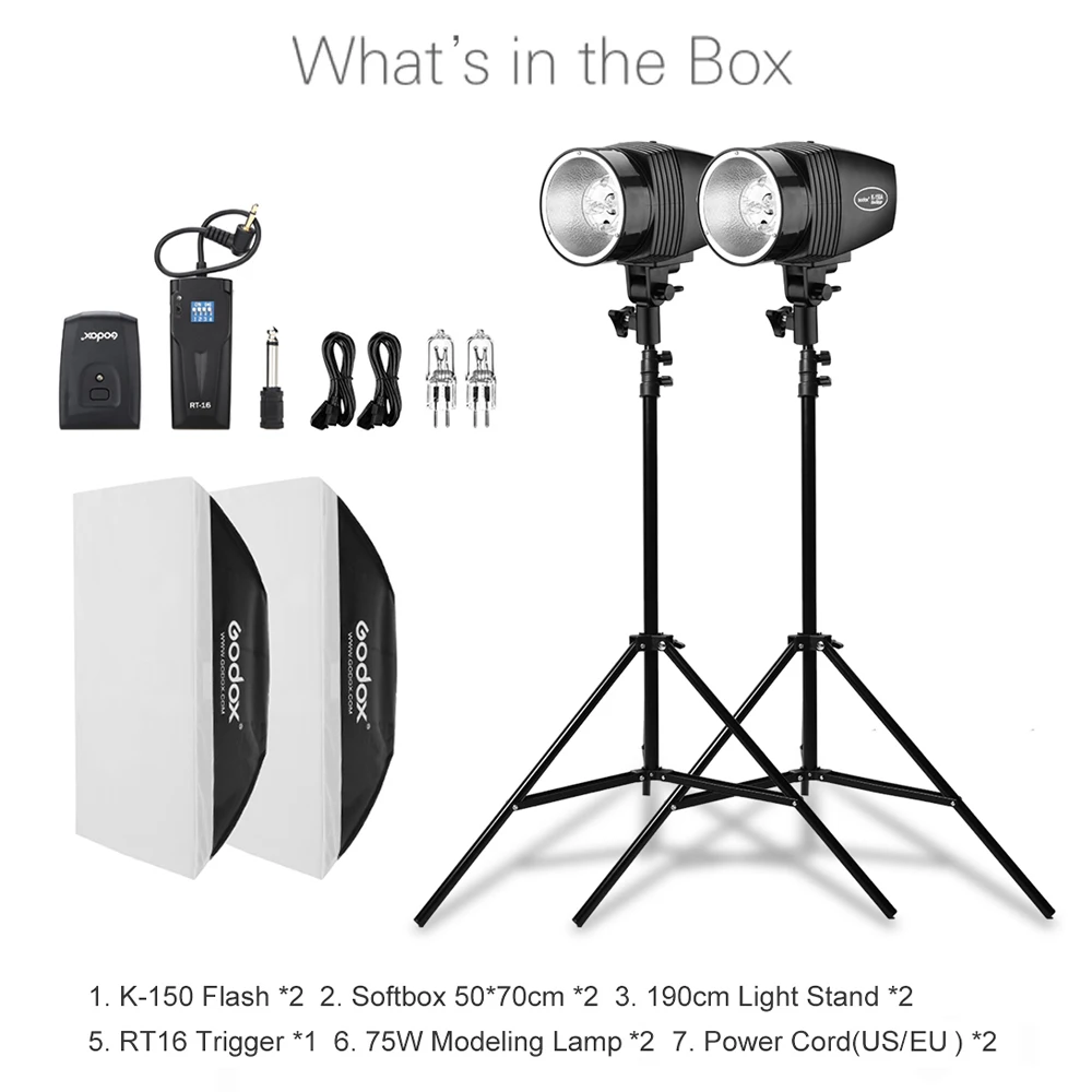 Посылка Вес: 125 г/4,4 oz Посылка: 2x набор Godox K-150A 2x светильник 190 см 2х Godox MS50x70cm софтбокс 1 триггер Godox RT-16