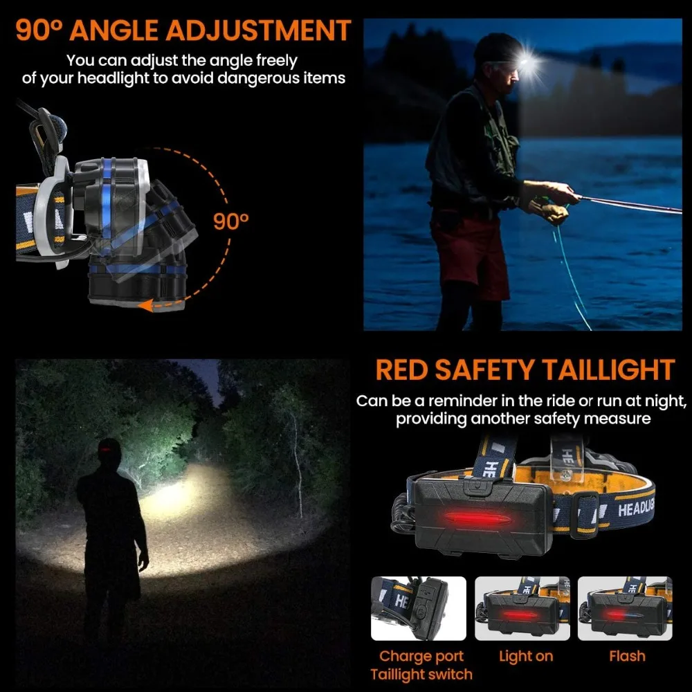 [IP4 водонепроницаемый и многоцелевой] перезаряжаемая фара имеет водонепроницаемую оценку IP4, водонепроницаемый переключатель, кабель, Высококачественная Батарейная коробка более герметичная, чтобы предотвратить утечку воды, И может использоваться обычно даже в дождливую и другую плохую погоду. Эта водонепроницаемая фара очень подходит для рыбалки, охоты, ночных гонок, Походов, Кемпинга, ремонта автомобилей, аварийно-спасательных работ и других видов деятельности на открытом воздухе и в помещении.