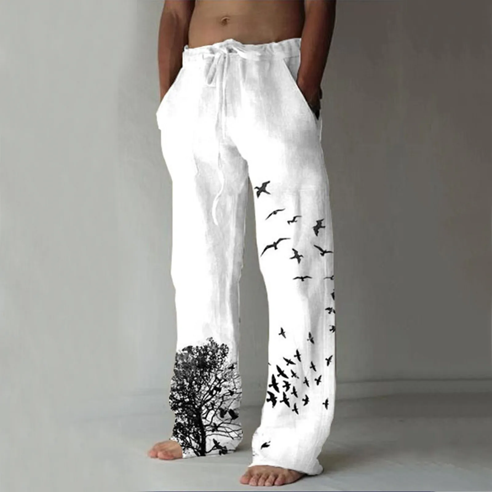 МEn's Повседневные длинные брюки с принтом дерева и птицы, Брюки с карманами и завязками