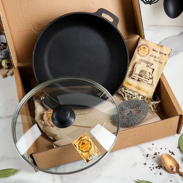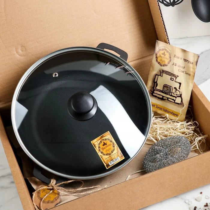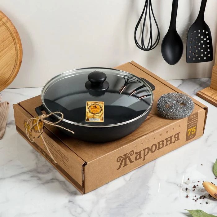 Отзывы о Жаровня чугунная литая 260 х 60 мм со стеклянной крышкой премиум набор | Дом и сад