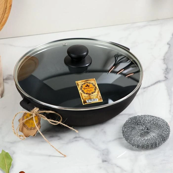 Жаровня чугунная литая, 260 х 60 мм, со стеклянной крышкой, премиум набор