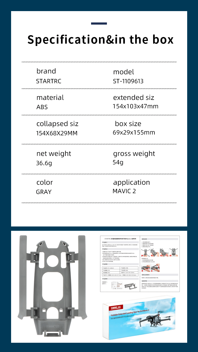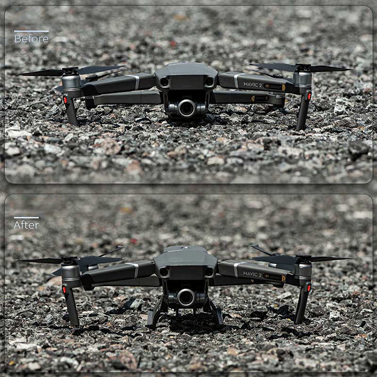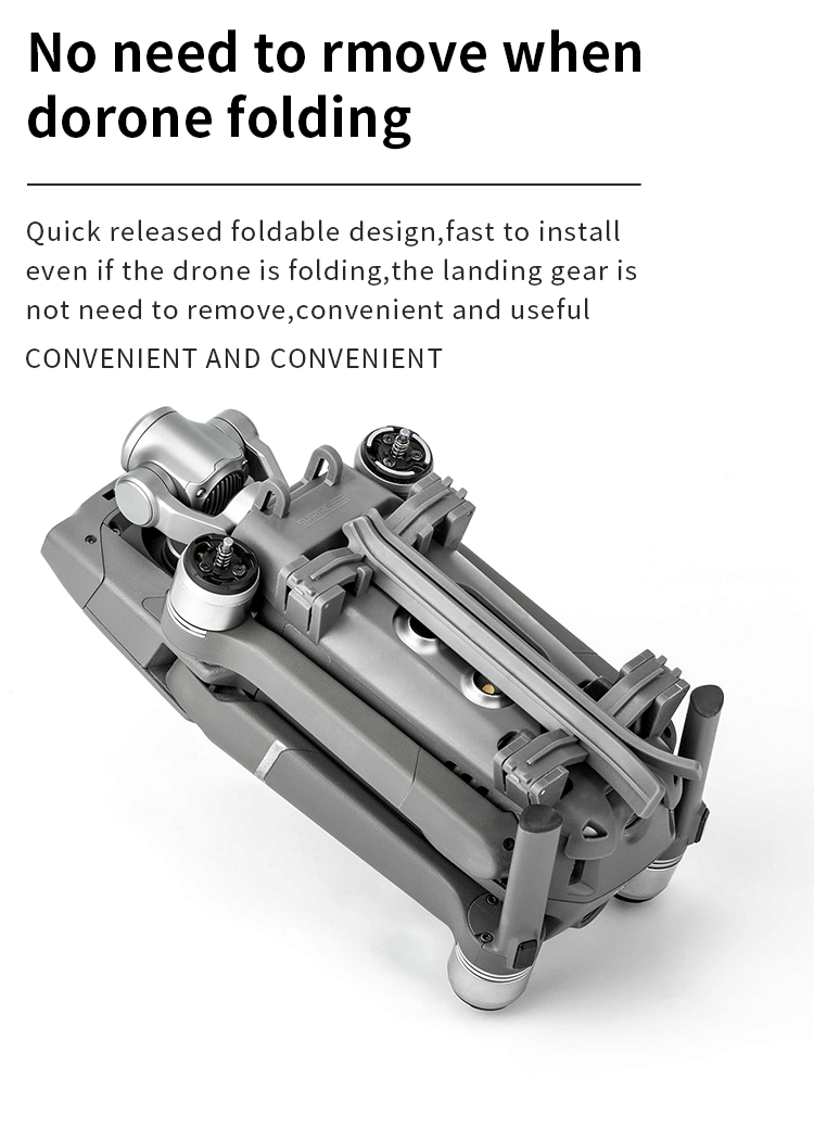 1. Легкий дизайн не доставит чрезмерную нагрузку на Дрон;2. Эффективно увеличивает высоту фюзеляжа на 35 мм, что может предотвратить заземление мусора от загрязнения фюзеляжа или повреждения карданного шарнира при взлете и посадке дрона, И он может все еще снимать и приземляться на неровной земле;